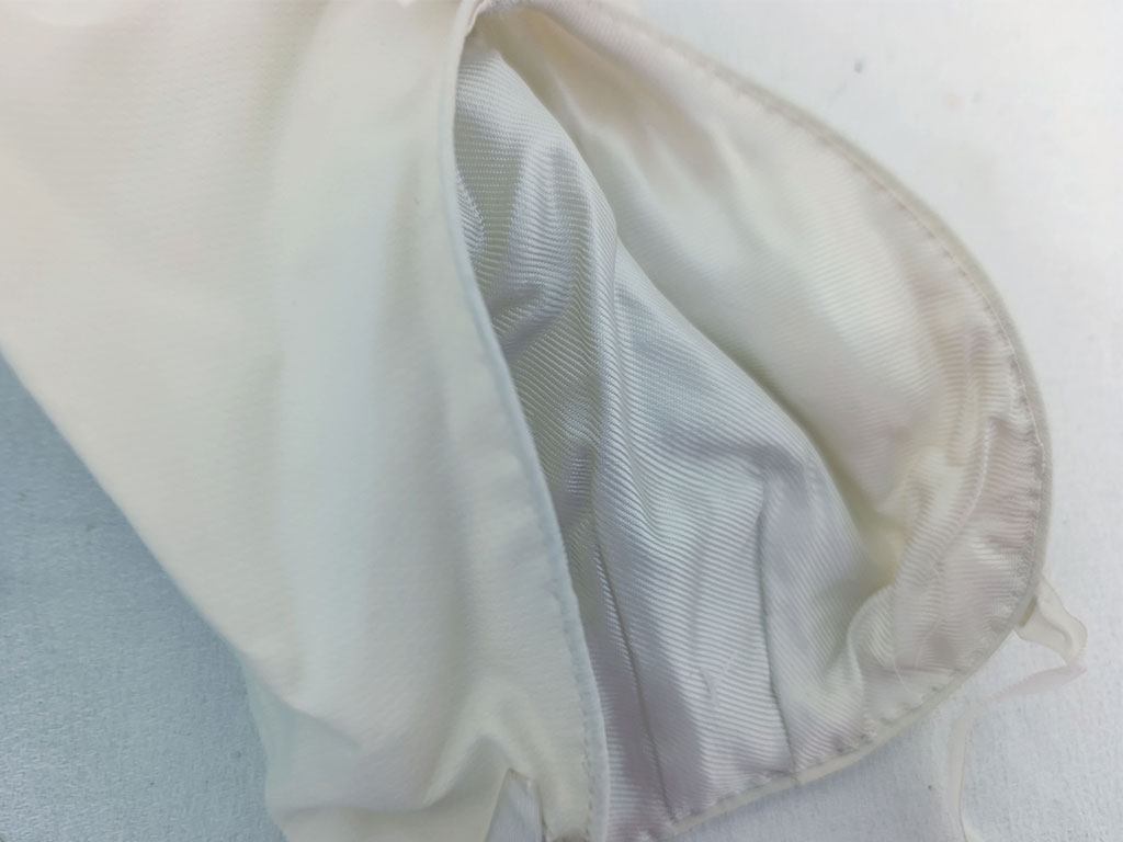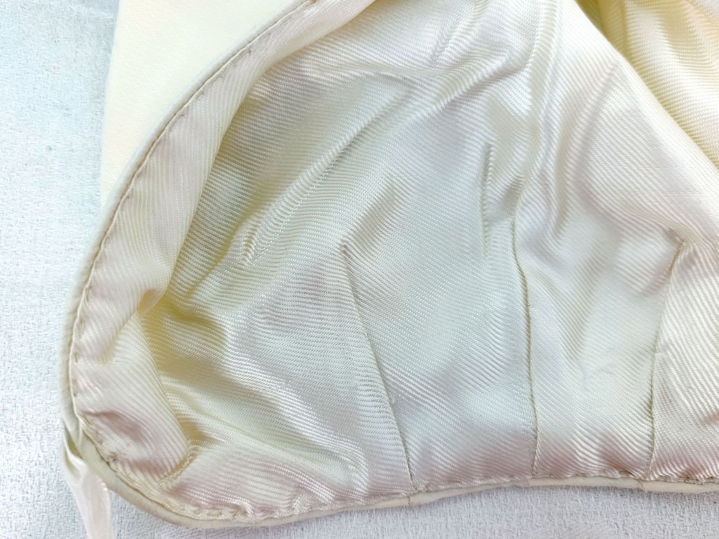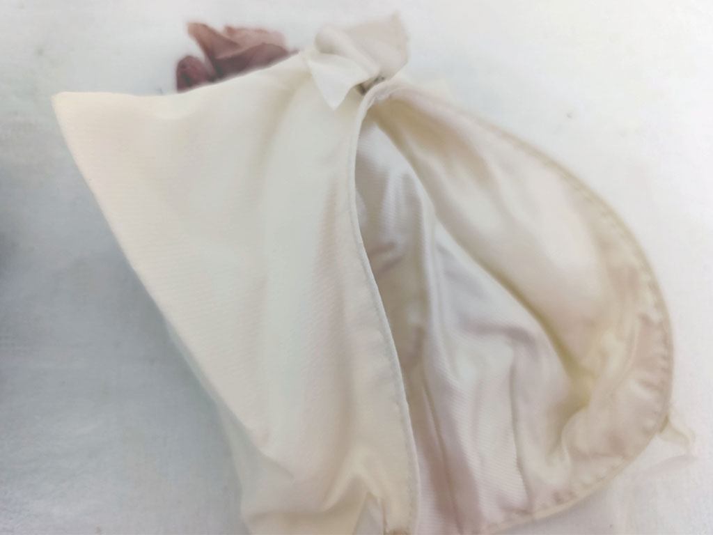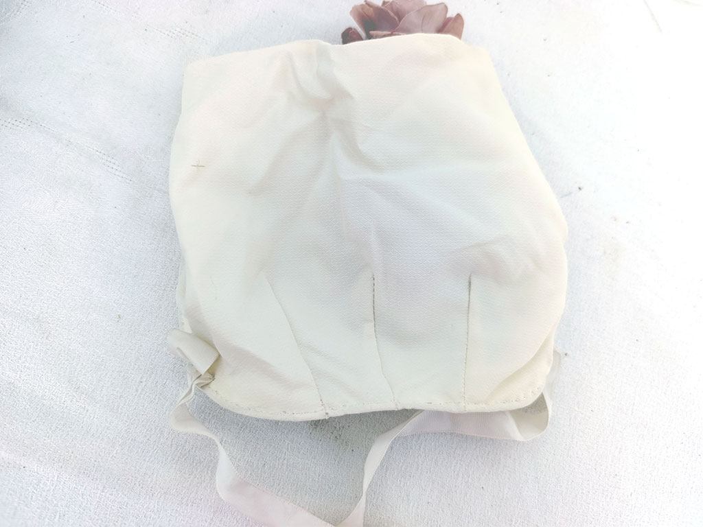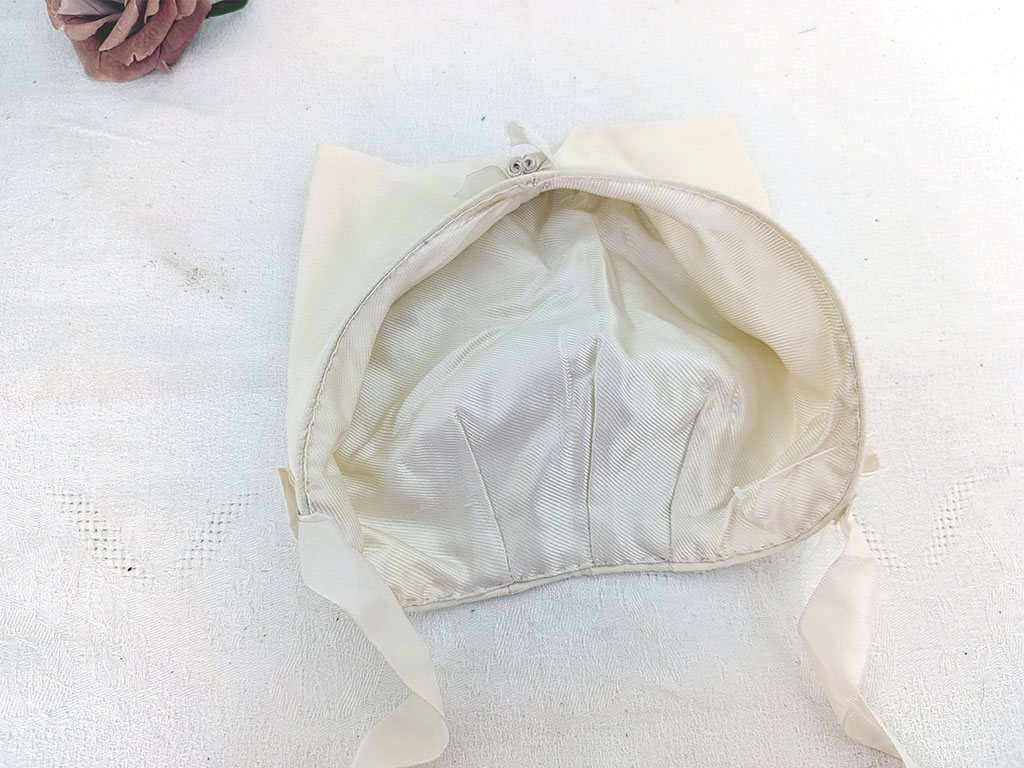 Voici un adorable petit béguin ancien pour enfant, sans doute des années 1940-50, réalisé dans un tissu satiné ivoire très doux au toucher. Ce modèle rare se distingue par sa forme spécifique à deux pointes sur le dessus, typique des béguins haut de gamme de l’époque. Entièrement doublé, il présente une jolie finition avec un ruban satiné sur le haut . C’est un très fin arc en métal rangé dans un ourlet qui maintient l’arrondi autour de la tete et de ce fait les 2 pointes. Il se ferme grâce à un large ruban en satin assorti en un seul morceau. Une étiquette, surement celle d’origine est cousue avec un simple point sur le ruban.