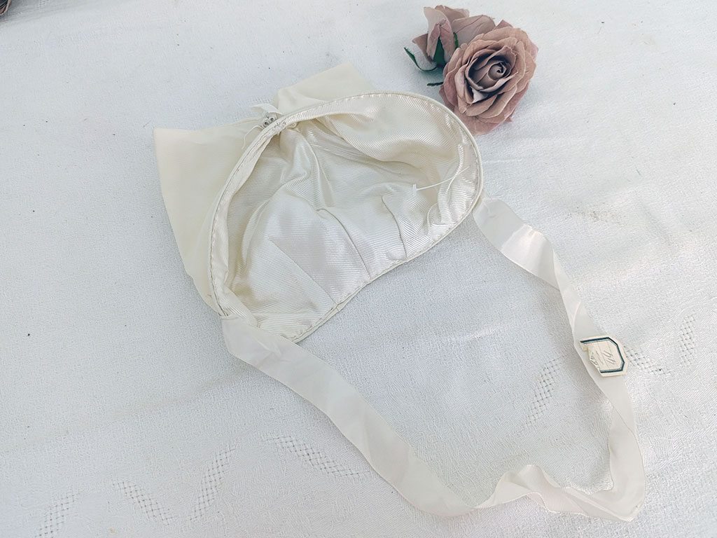 Adorable béguin ancien pour enfant en tissu satiné ivoire, daté des années 1940-50. Avec sa forme à deux pointes et son large ruban de fermeture, il évoque toute la douceur des vêtements d’époque. Idéal collection ou déco rétro. Etiquette encore présente.