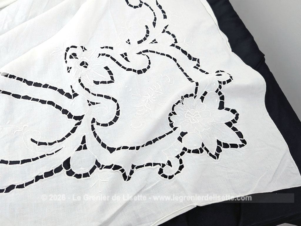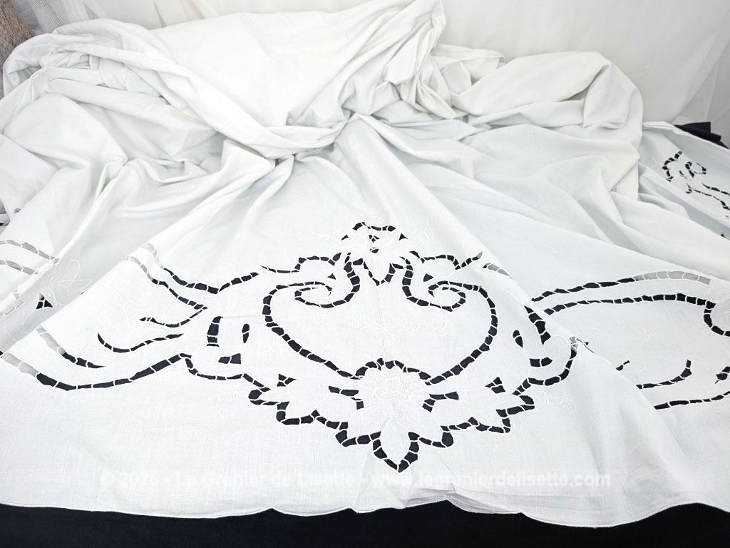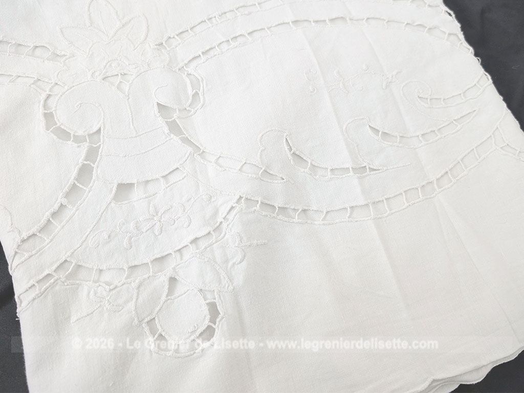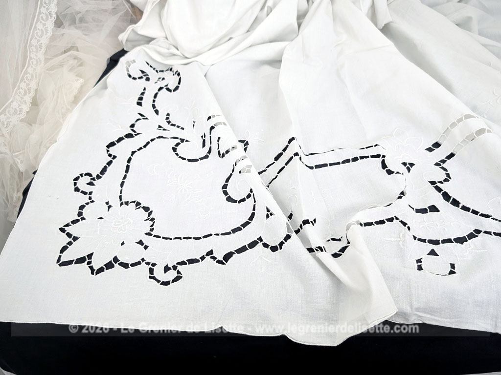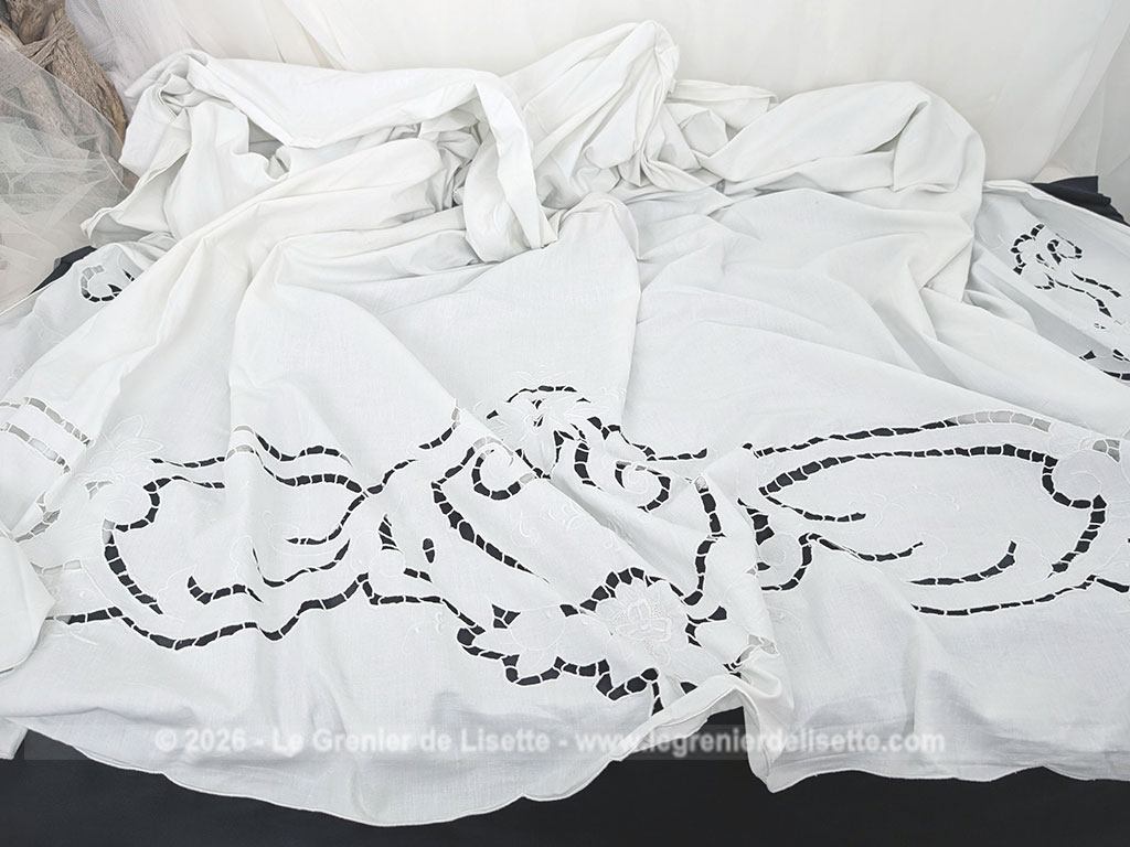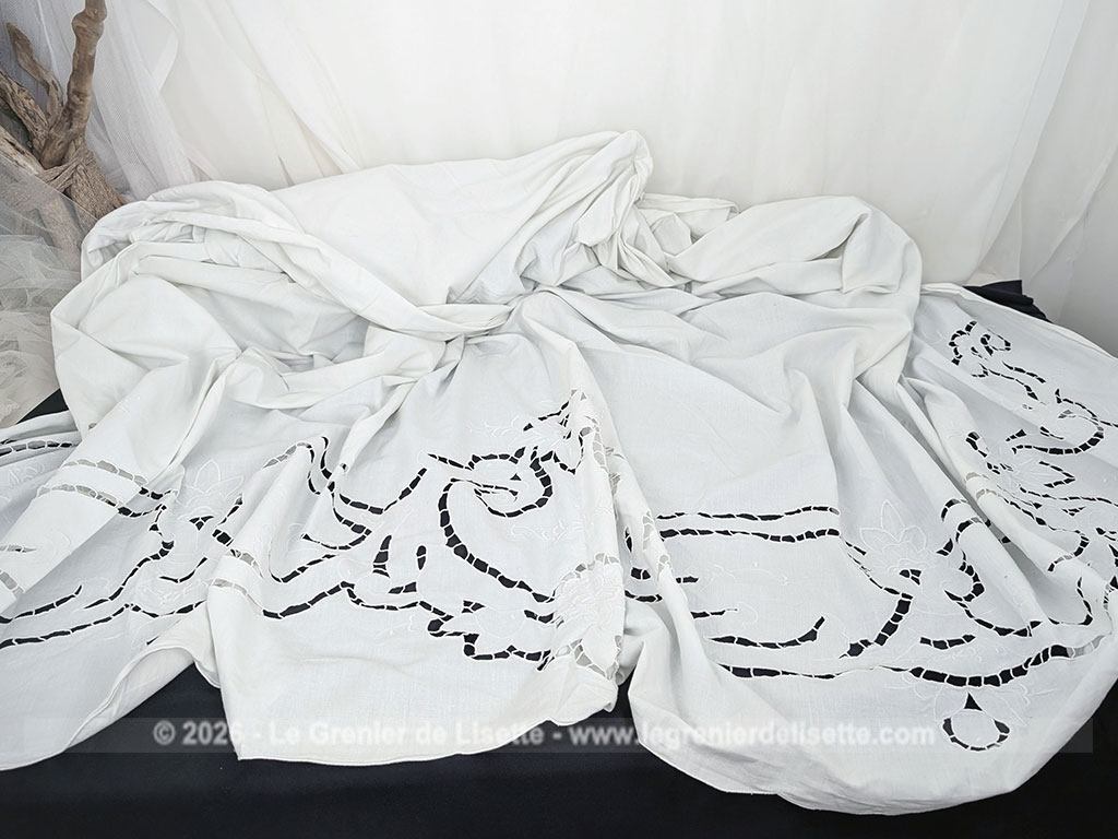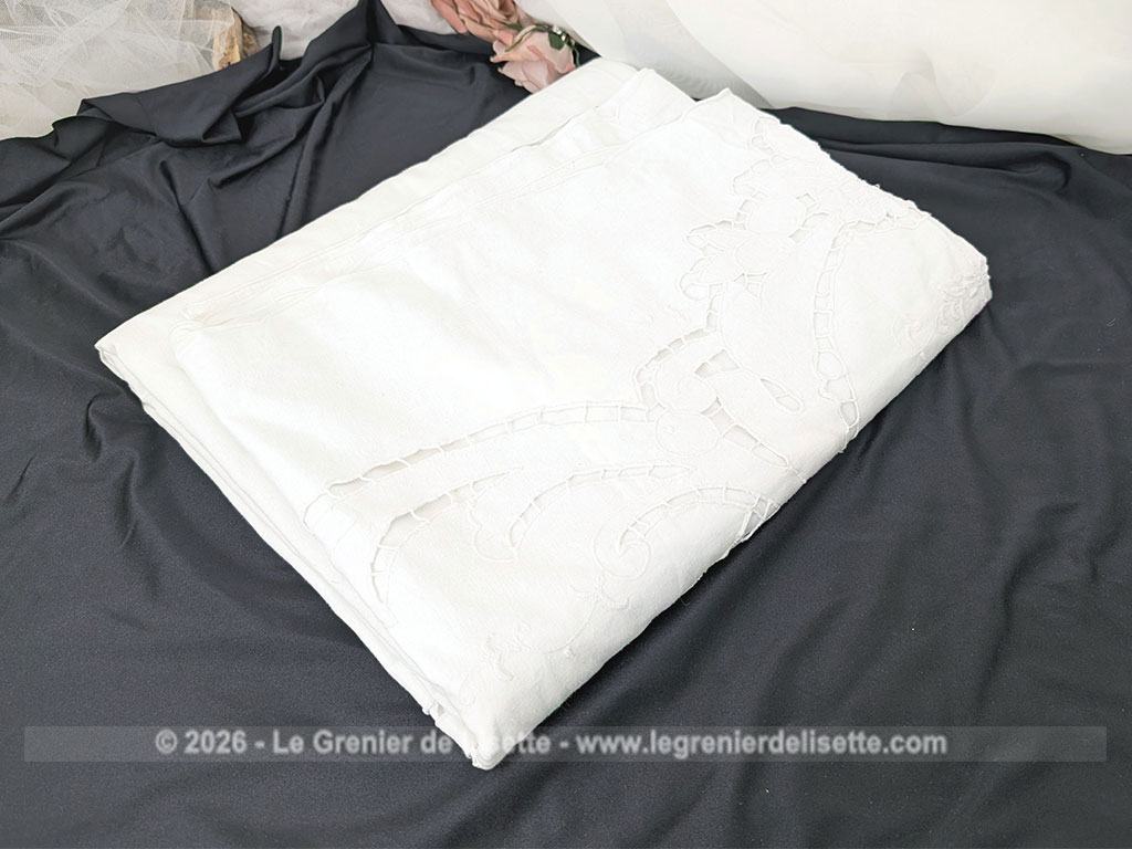 Voici un drap ancien en toile légère et souple avec un magnifique rabat en broderie Richelieu composée de motifs de fleurs et de volutes ajourés sur une hauteur de 58 cm. Avec ses dimensions de 230 x 250 cm, c’est une pièce saine et très élégante qui apporte immédiatement une touche de charme authentique à une chambre.