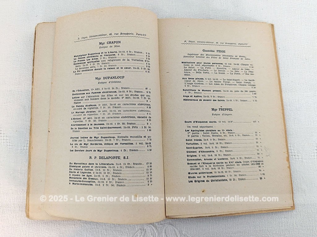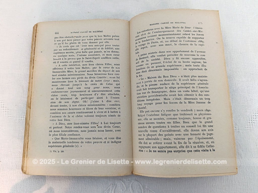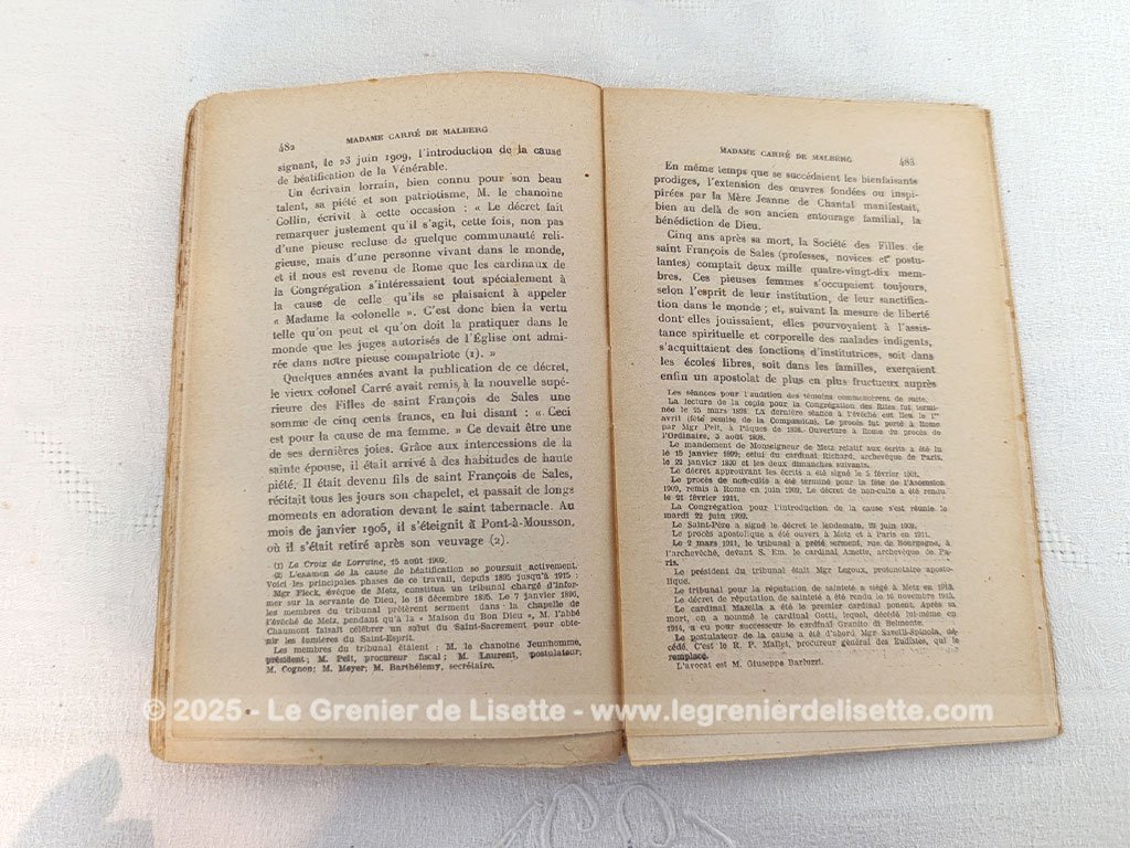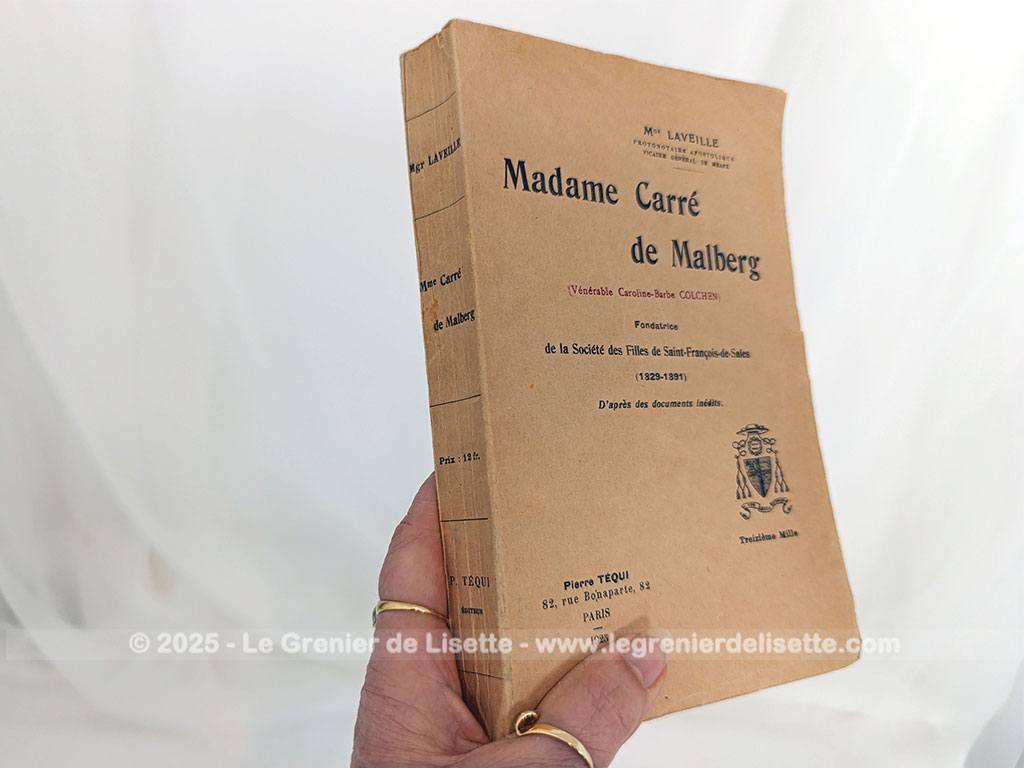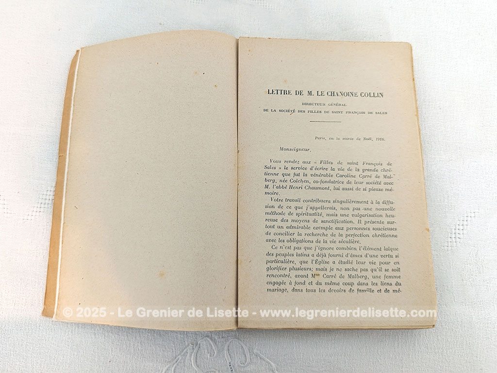 Voici un ouvrage au charme ancien, à la couverture souple et aux pages coupées à la main. Ce livre renferme le récit émouvant d’une femme discrète mais au destin hors du commun. Le destin de celui de Madame Carré de Malberg, née Caroline Colchen en 1829, fut épouse, mère, puis veuve, marquée par la douleur mais illuminée d’une foi profonde. Le livre retrace sa vie dans une époque troublée. En effet, elle choisit la voie de l’abandon total à Dieu tout en restant pleinement femme du monde. Refusant le cloître, elle fonde l’Œuvre des « Filles de Saint François de Sales », une société de vie spirituelle ouverte aux femmes laïques, engagées dans la société. Sous la plume bienveillante de Mgr Laveille, ce livre tisse à travers des documents originaux les fils d’une vie toute donnée, traversée d’épreuves, de silences et de rayonnements intérieurs. La couverture est un carton souple, les pages coupées à la main avec différentes tailles, ont les bordures légèrement ombrées par le temps passé.