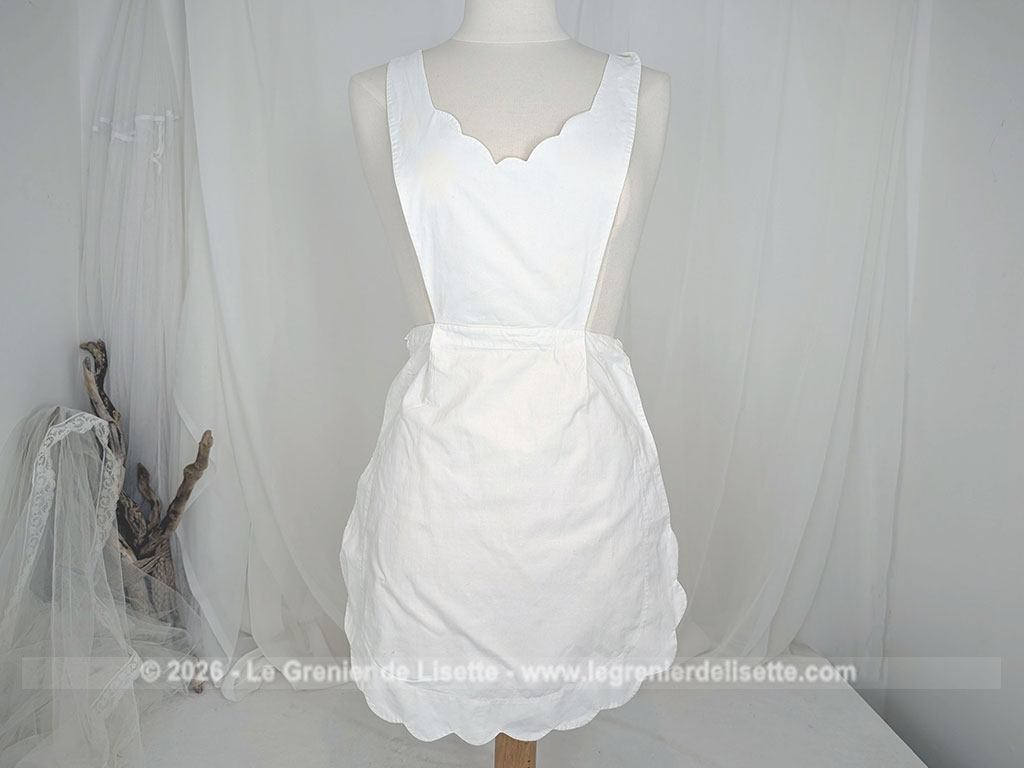 Réalisé dans un beau coton blanc de qualité, voici un ancien petit tablier de « service » ou de « soubrette » fait main., au charme indéniable avec ses grandes vagues brodées en forme de demi-lunes sur le pourtour du bas et le haut du plastron.
