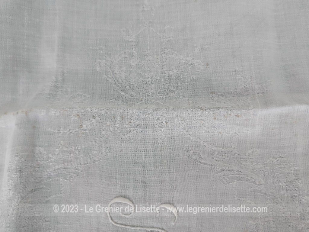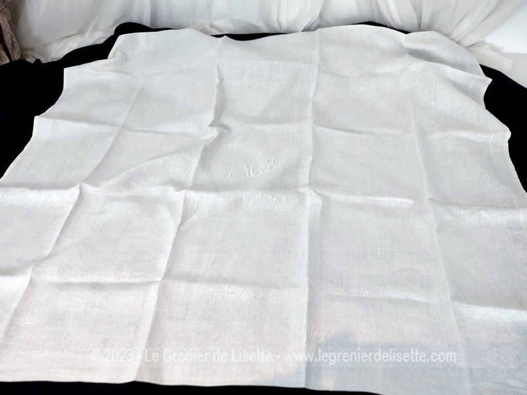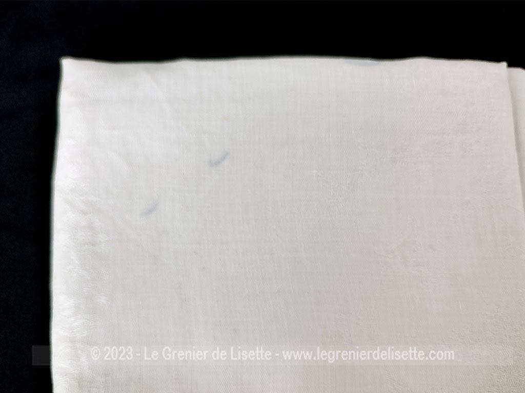 Sur 90 x 74 cm, voici un ancien torchon ou grande serviette en coton blanc damassé. On découvre au centre les monogrammes M et E brodés en fils blancs sur 9 x 4.5 cm.Le damassé est léger et discret. Deux minuscules petites auréoles bleues sont visibles. (voir photos). Alors laissez faire votre imagination sur l’utilisation de ce beau torchon ou grande serviette brodés des monogrammes M et E.
