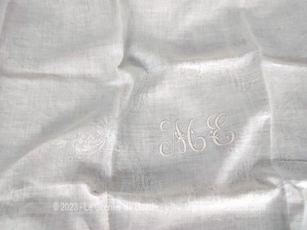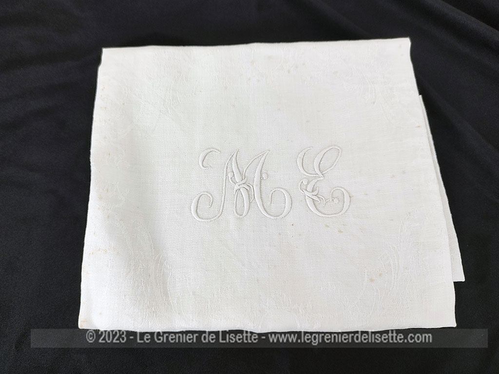 Ancien torchon ou grande serviette de 90x 74 cm en coton blanc damassé avec au centre les monogrammes ME brodés.