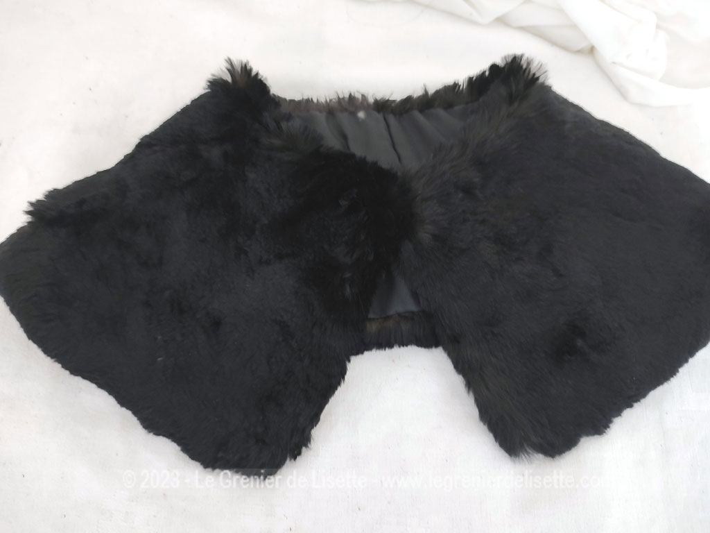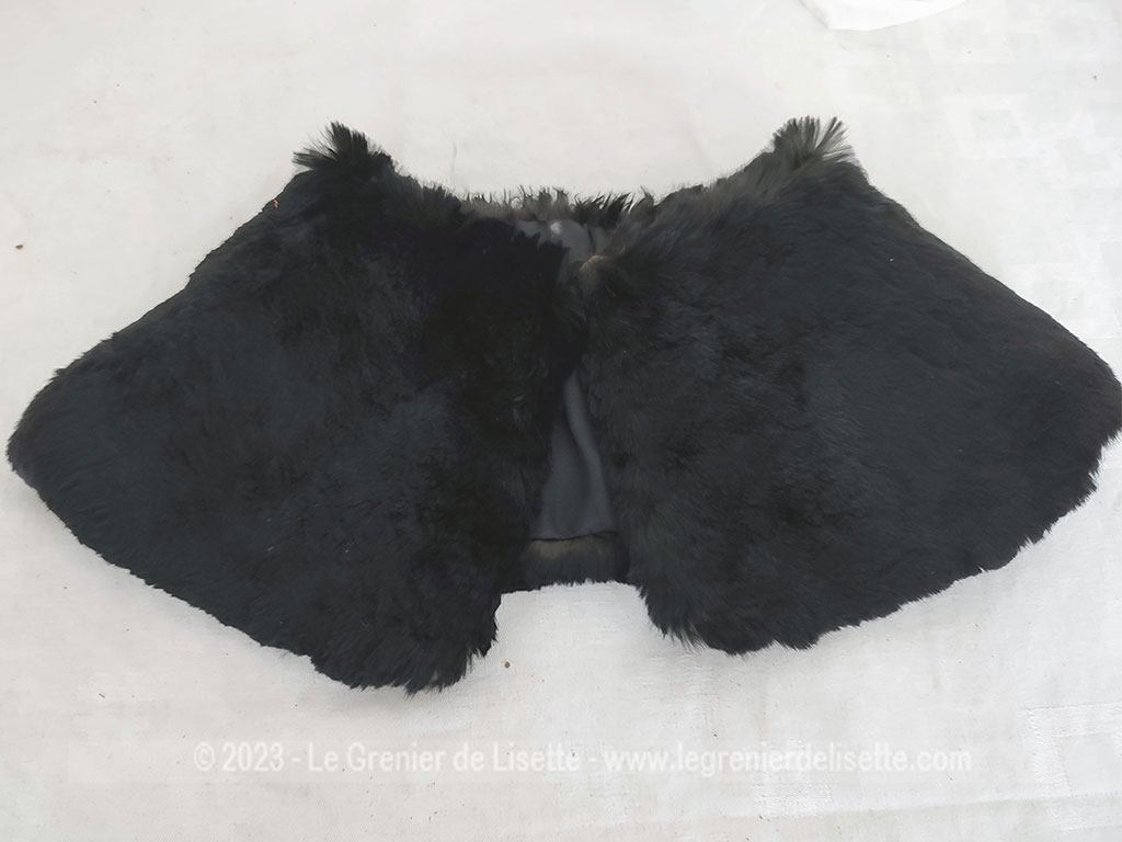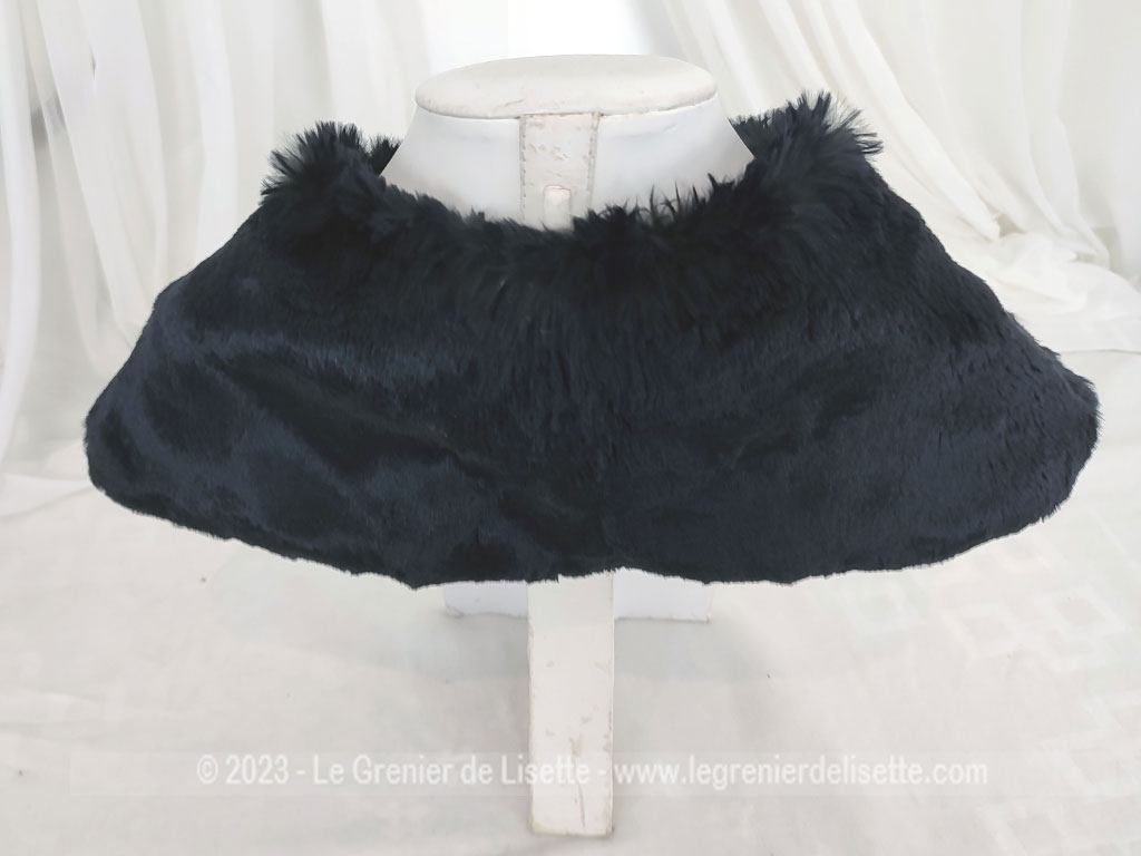 Voici un superbe col tour de cou en superbe fourrure noire toute douce se fermant par deux crochets. Il mesure 45 cm de long sur la partie tour de cou et 78 cm sur la partie basse, le tout sur une hauteur de 15 cm. La fourrure est aussi douce qu’une peluche et semble véritable. Elle est réalisée en 4 morceaux, visibles uniquement au toucher. Un beau satin noir sert de doublure. Il y a deux crochets pour fermer. Il y en a un dans l’angle pour fermer le haut et l’autre à 3 cm du bas. Ce sont de gros crochets habillés de fils comme on faisait avant. Ce col a vraiment une forme  vintage avec sa forme de trapèze. ! Ce superbe col sera à porter tel quel, à poser sur un manteau, ou par dessus un autre col…  pour une allure vintage assurée !