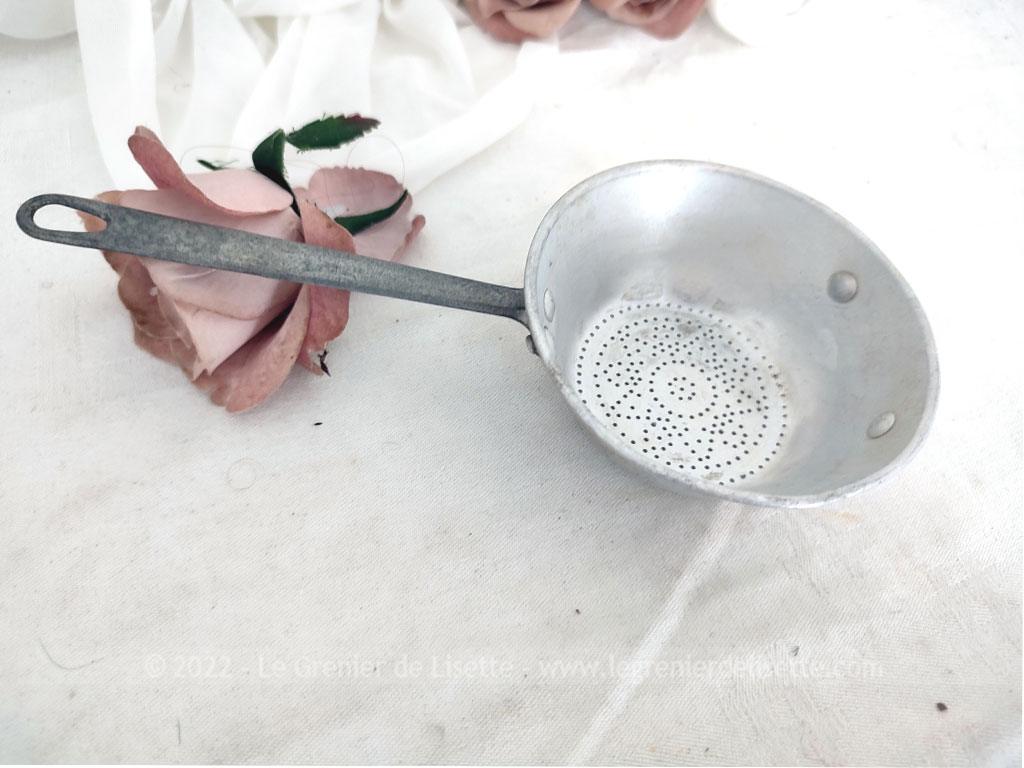 En décoration ou à utiliser, voici une ancienne mini passoire écumoire alu de 9.3 cm de diamètre et 19.5 cm de long.