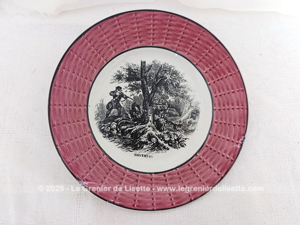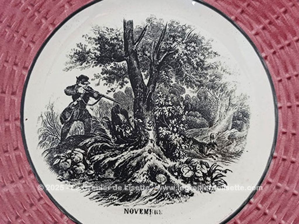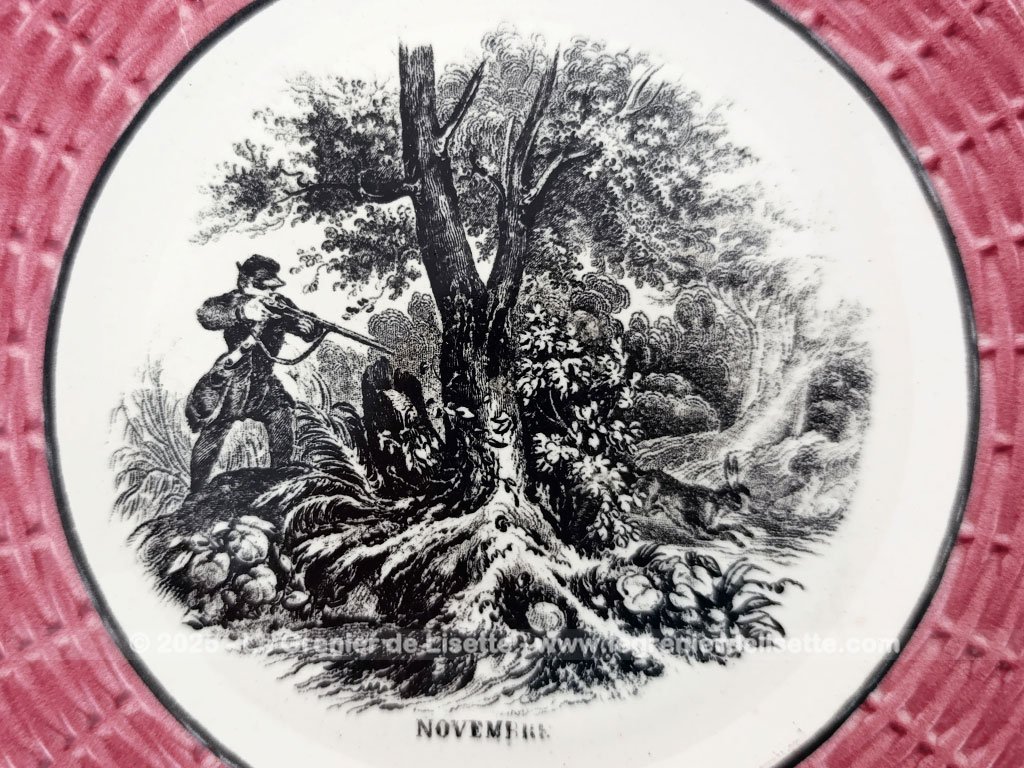 Datant du début des années 1900, voici un ancienne petite assiette parlante de 18 cm de diamètre estampillée Sarreguemines Digoin, bordure rose et au centre une scène de chasse correspondant au mois de novembre.