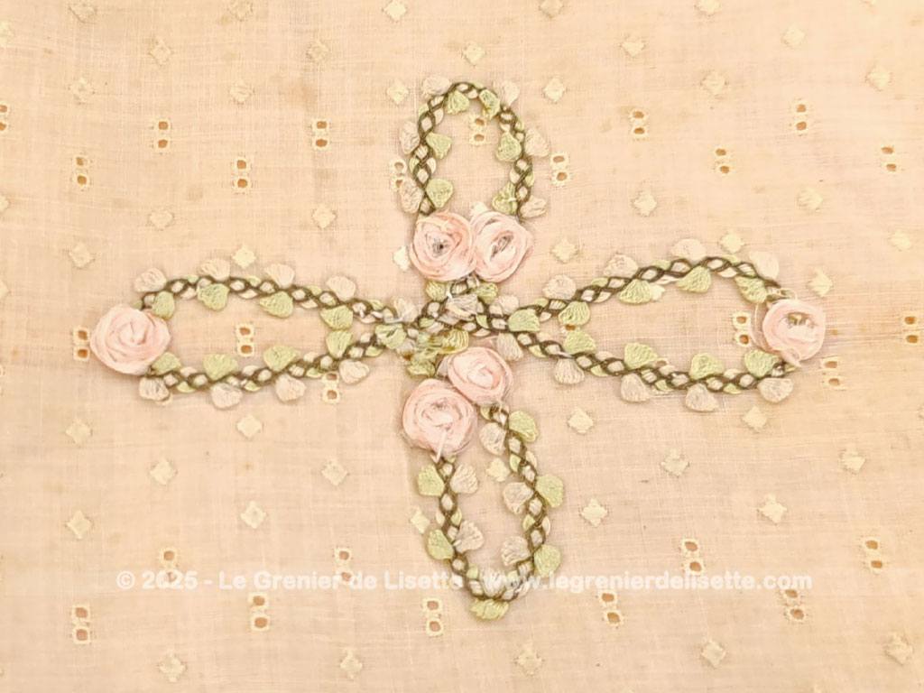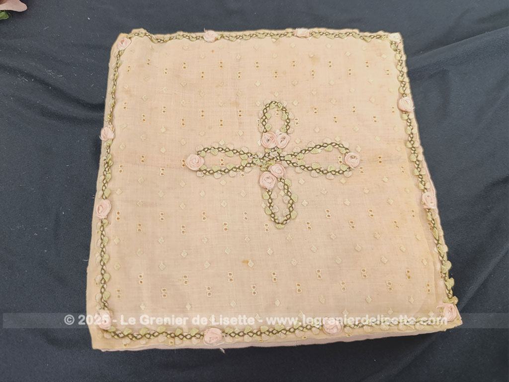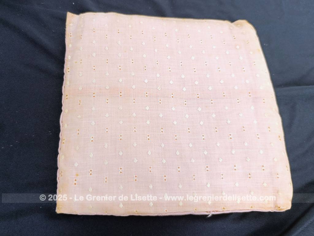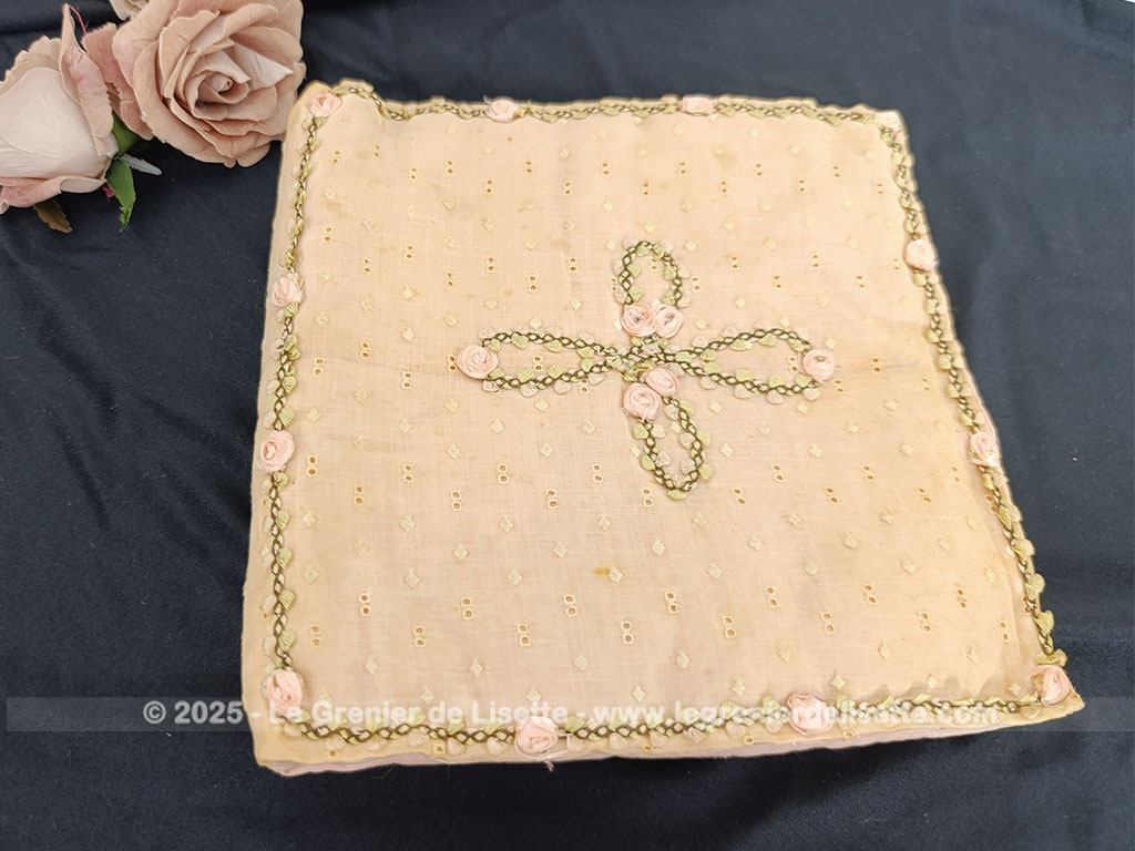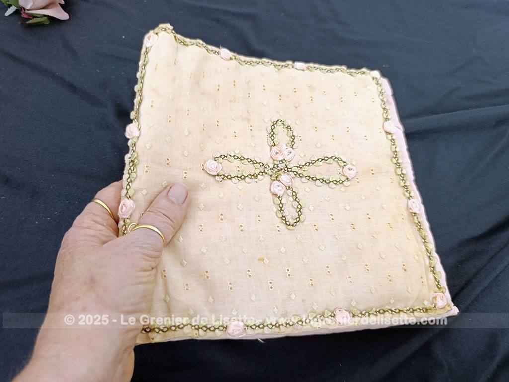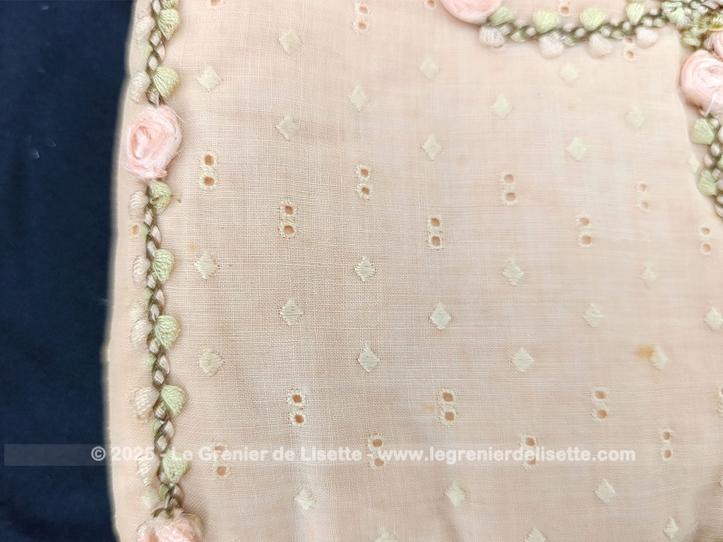 Voici une ancienne et superbe pochette en coton couleur saumon datant du milieu du siècle dernier. Elle mesure fermée 23 x 22 cm. Le tissus ajouré façon « broderie anglaise » est aussi entièrement habillé de petits pois brodés. Entièrement fait main, on découvre une seule face décorée. Sur cette face, tout n’est qu’un subtil jeux de broderie et de fleurs en ruban.
