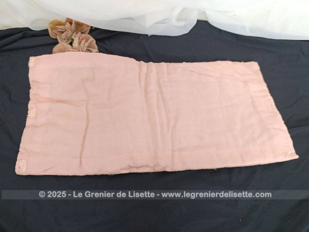 Alors, pour mettre en valeur cette face, il y a une fine guirlande de broderies surlignée par de petite fleurs roses. Elles sont savamment réalisées par un ruban. Puis au centre, avec la même guirlande, on découvre un motif de 4 ovales. Ils sont reliés entre eux et réalisés avec les mêmes décorations. Cette pochette se trouve remplie de ouate à l’intérieur, ce qui lui donne une belle épaisseur L’habillage de la partie intérieure est en soie couleur saumon. Il y a deux ou trois minuscules auréoles, à peine visibles, légères marques du temps passé l’origine, cette pochette se fermait par des boutons d’un coté et des petites boucles en ruban de l’autre. Aujourd’hui, il ne reste que 3 vestiges de ruban coupé, bien cousus pour former une pochette uniforme. (voir photo).