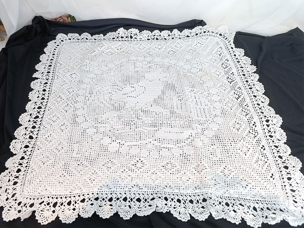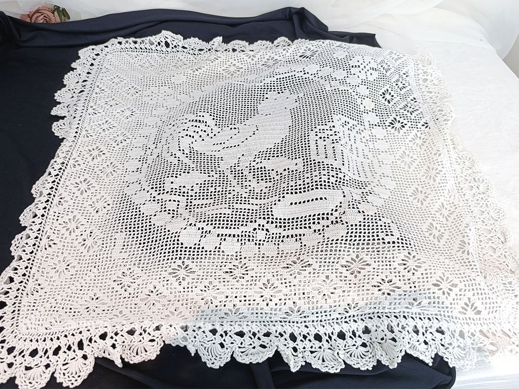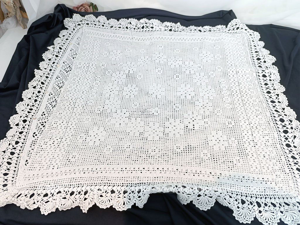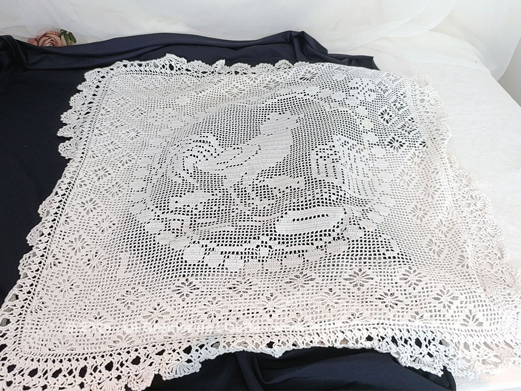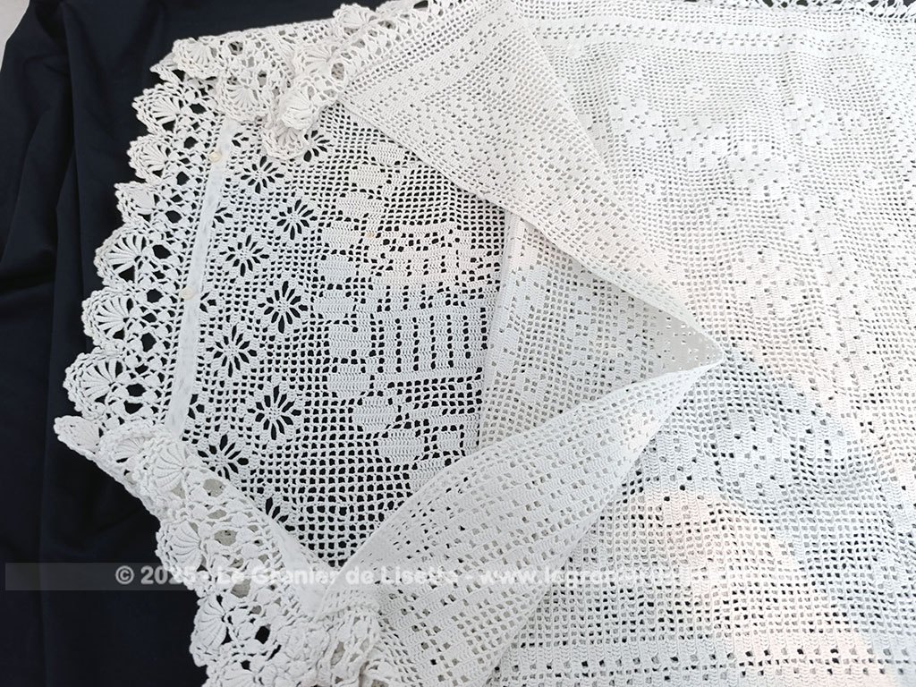 Voici une ancienne taie d’oreiller blanche réalisée recto verso au crochet en fil de coton épais. On découvre d’un coté le dessin d’un coq dans un cercle de guirlande et au dos un mélange de fleurs. Elle mesure 60 x 57 cm. C’est une pièce unique. Il y a une très petite auréole (voir photo). La taie se ferme par 5 petits boutons en nacre. Une bordure « dentelle » au crochet de 6 cm décore tout le pourtour.