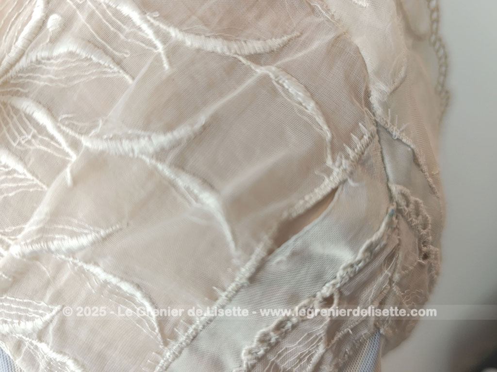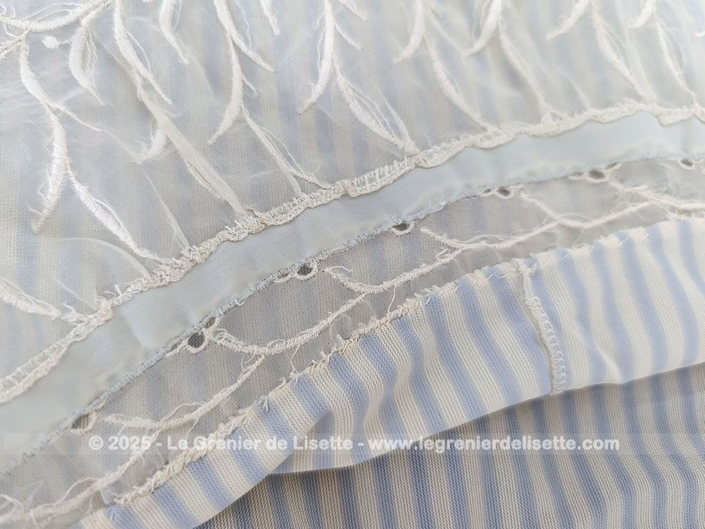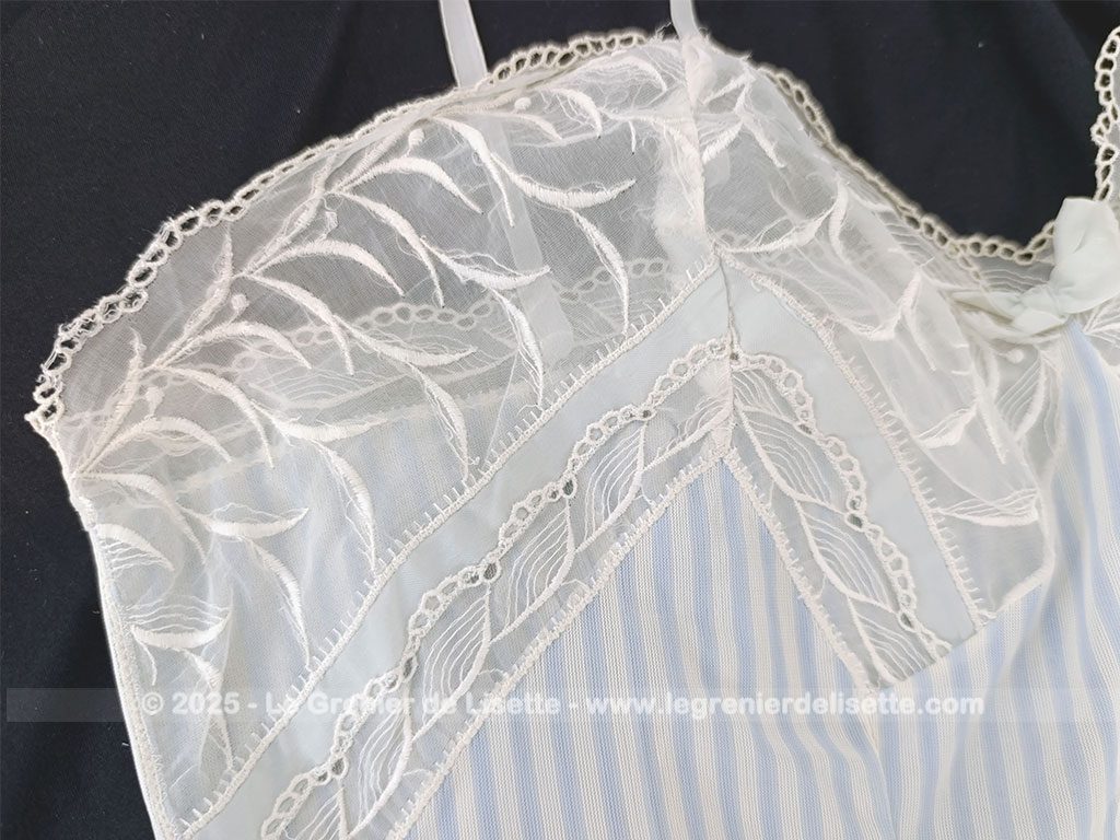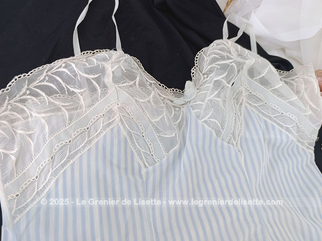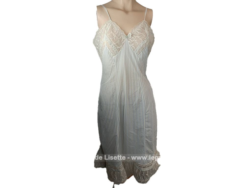 Voici un beau déshabillé couleur ivoire à fines rayures bleues, de la marque SCHIESSER Aus. Datant des années 60/70,  c’est un beau déshabillé en dentelle et en « Perlon »  fibre synthétique allemande similaire au Nylon. Il y a une étiquette cousue sur une couture intérieure indiquant la marque et la taille 44 de l’époque. Aujourd’hui, cela correspond plus à une taille 40. La dentelle est de couleur ivoire et ce sont de fines rayures bleues qui décore le déshabillé. Le tissus n’est pas extensible. La dentelle est vraiment mise en valeur sur la partie poitrine par un savant jeu de coutures. De même, la décoration qui habille le bas mêle ruban et dentelle. C’est tout ce jeu dentelle qui donne vraiment beaucoup de charme et d’élégance à ce déshabillé. Les bretelles ont été raccourcies à la main par un pli alors la longueur est toujours là si vous en avez besoin.