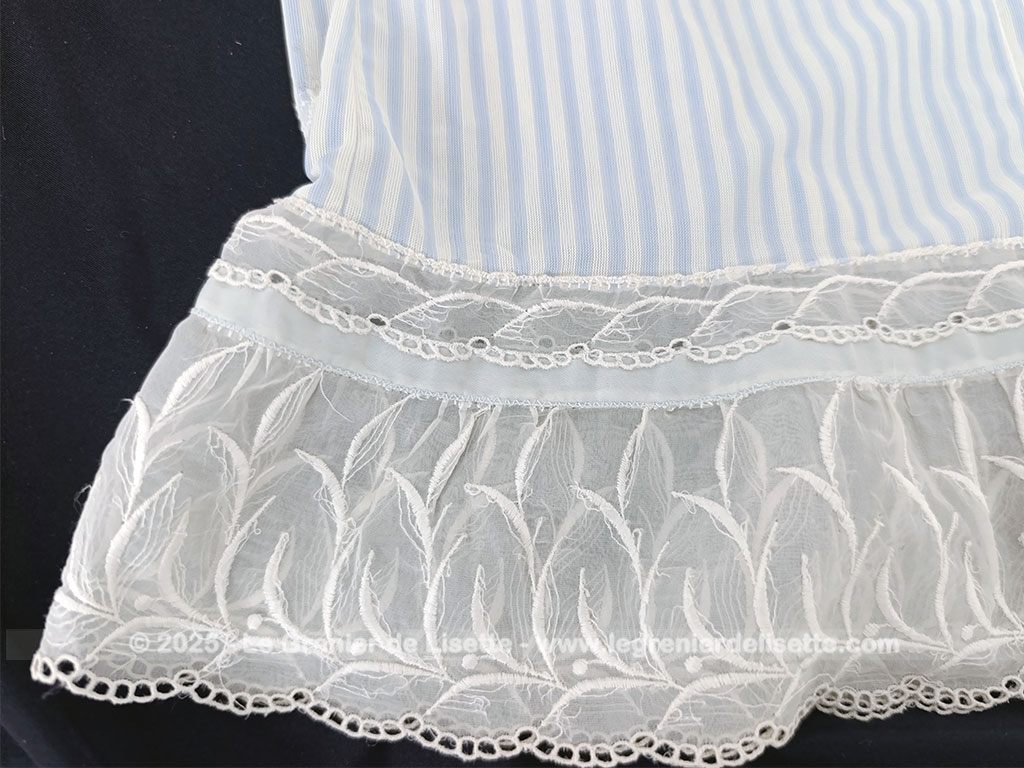 Voici un beau déshabillé couleur ivoire à fines rayures bleues, mi long de la marque SCHIESSER Aus. datant des années 60/70 en polyamide avec en bas une large et belle dentelle.  Superbe et vintage même la nuit !