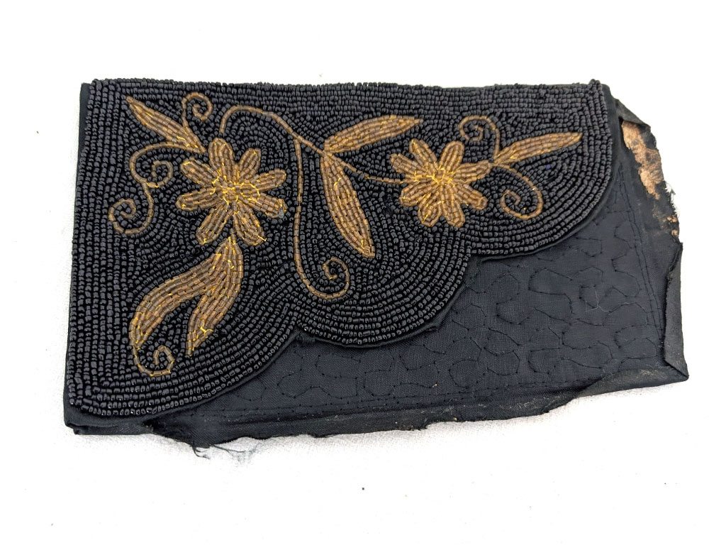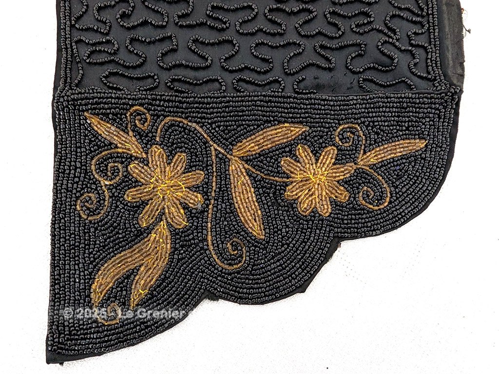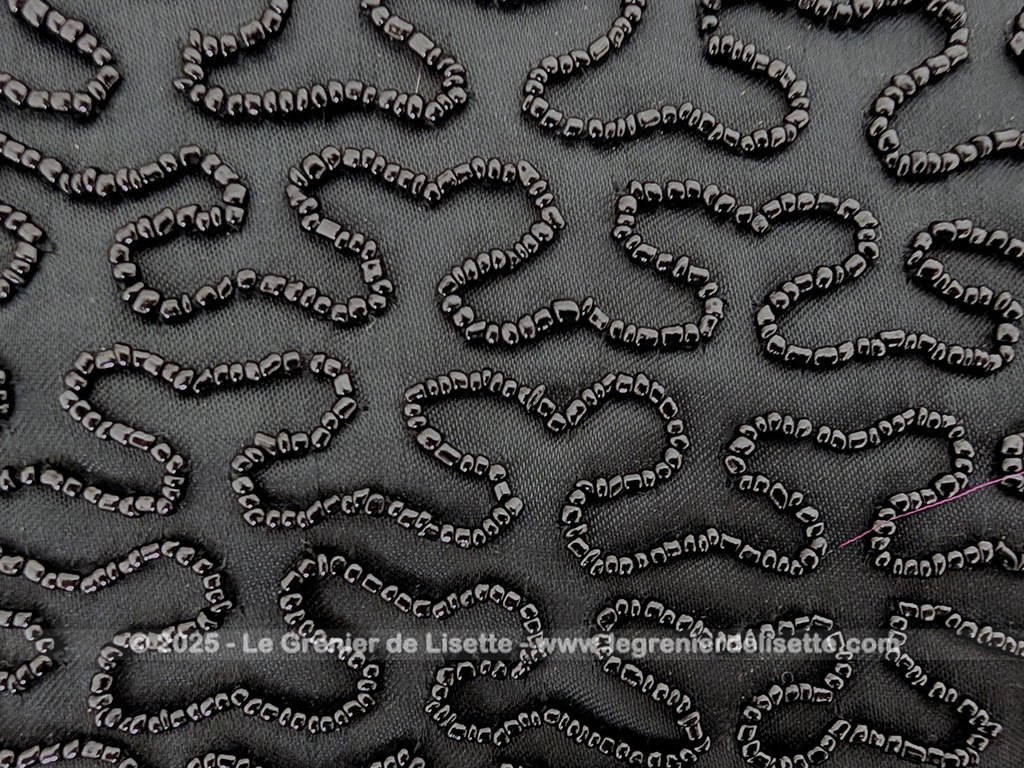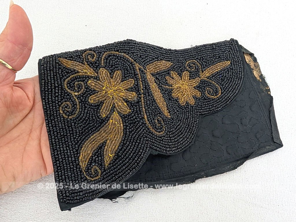 Ancien et original, voici les vestiges d’une belle petite sacoche à main, décorée par un superbe travail de perles de rocaille noires et dorées, travail minutieux des années 40/50.