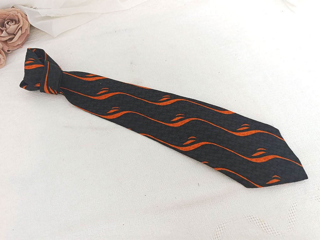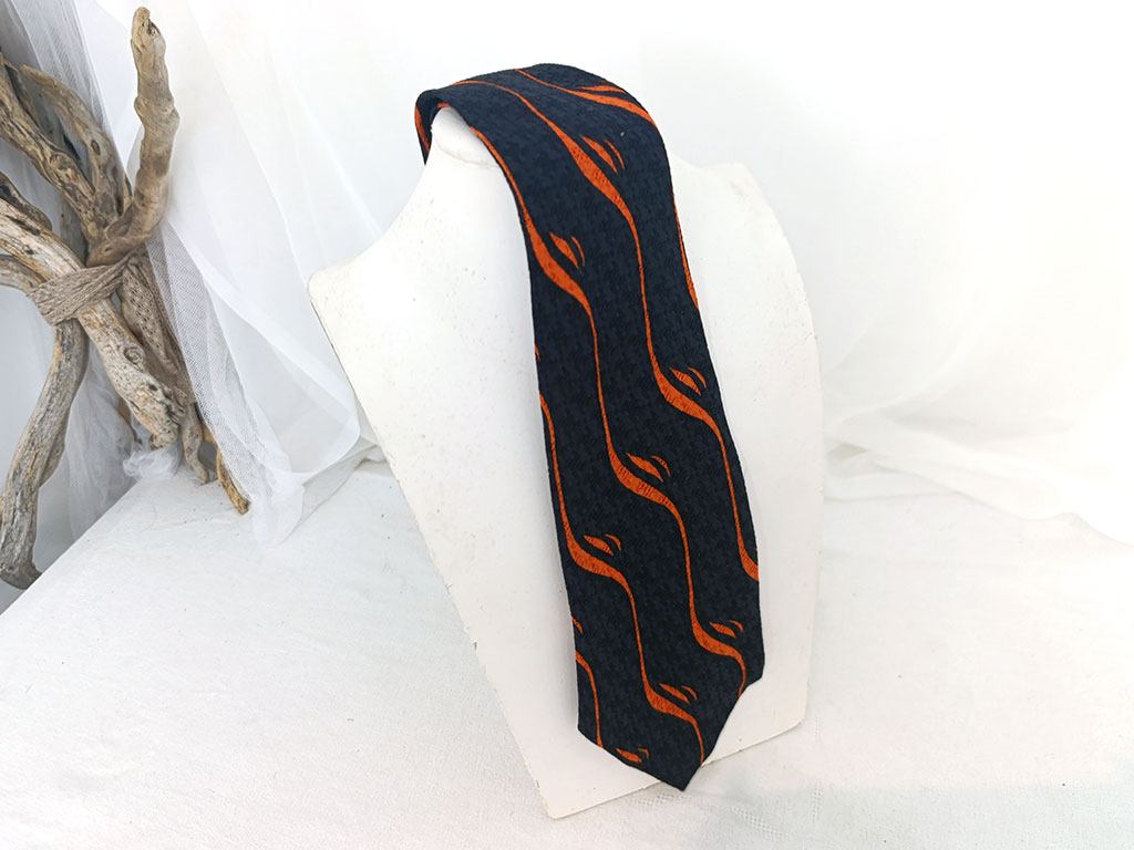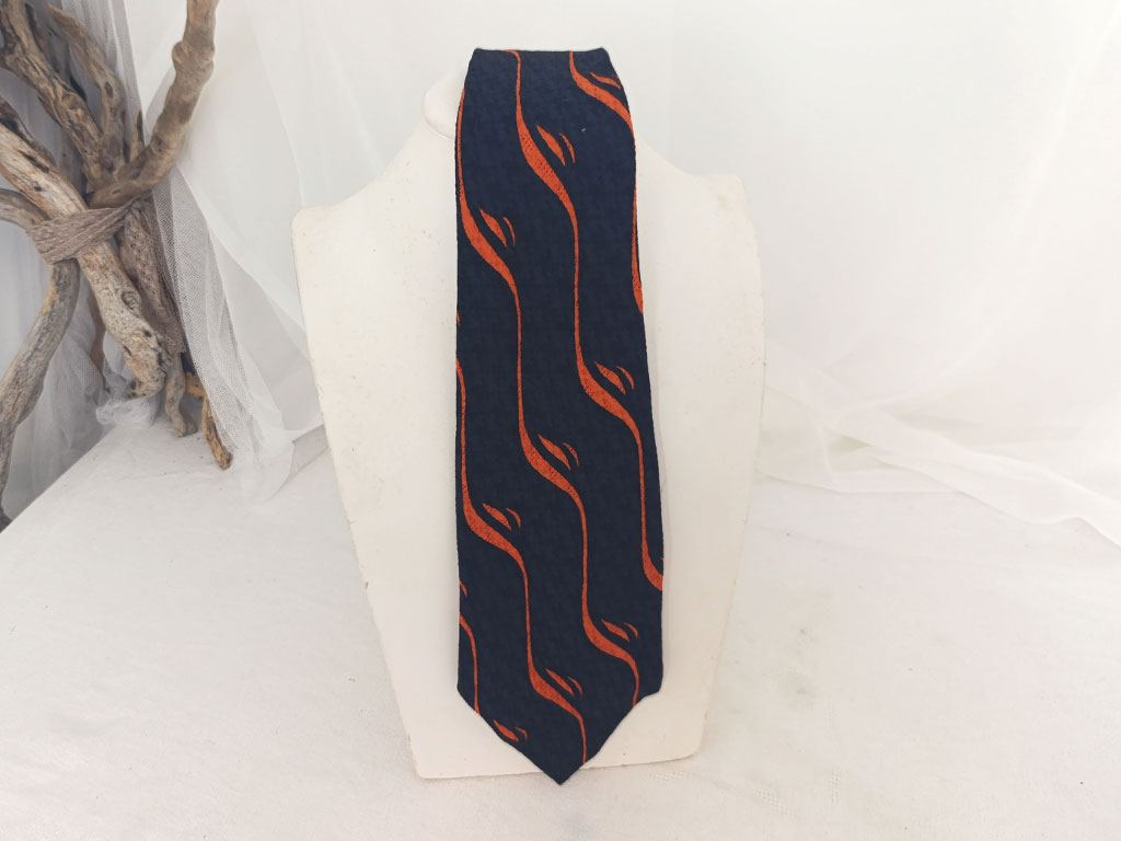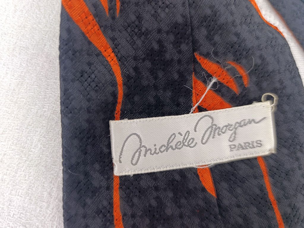 Voici une superbe cravate recherchée car limitée de la marque Michèle Morgan Paris. En effet, à la fin des années 70, consternée par le manque d’originalité des cravates disponibles, Michèle Morgan décide de créer sa propre ligne. En soie choisie, aux motifs raffinés et aux couleurs lumineuses, ses créations se distinguent immédiatement et imposent un style unique. Même si cela ne dura qu’un temps, ses cravates sont de véritables merveilles de l’époque. Cette cravate ci est en soie bicolore, avec sur fond noir, des dessins de vagues verticales couleur orange. La texture de la soie est montre un fin relief en forme de petit damier. Elle mesure 145 cm de long. Il y a 12 cm de marge d’un coté et 4 cm de l’autre Une étiquette indique bien « Michèle Morgan – Paris ». Le doublure en soie est également estampillée Michèle Morgan. L’étiquette sert de passant pour laisser s’insérer la deuxième partie de la cravate. La cravate est comme neuve. Elle sera à porter décontracté, habillé ou…. comme vous voulez, mais vraiment dans un style très original et complétement seventies !