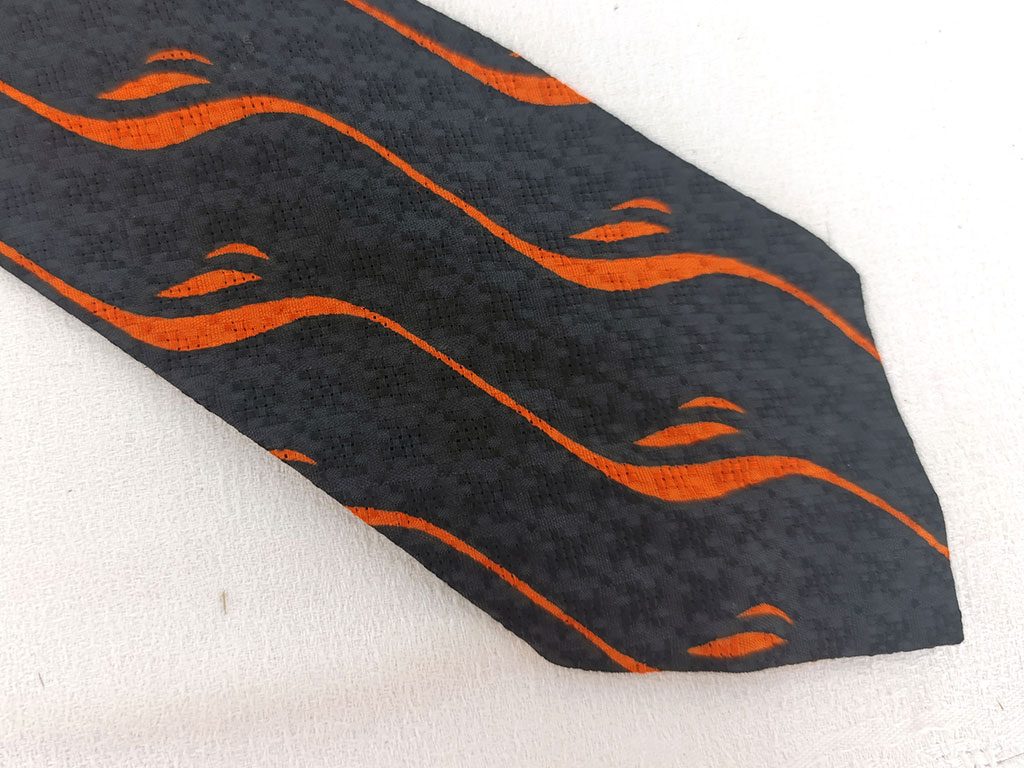 Voici une superbe cravate recherchée car limitée de la marque Michèle Morgan Paris, en soie bicolore, avec sur fond noir, des vagues verticales couleur orange. Doublure soie également estampillée Michèle Morgan.