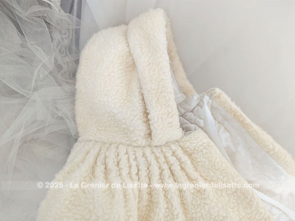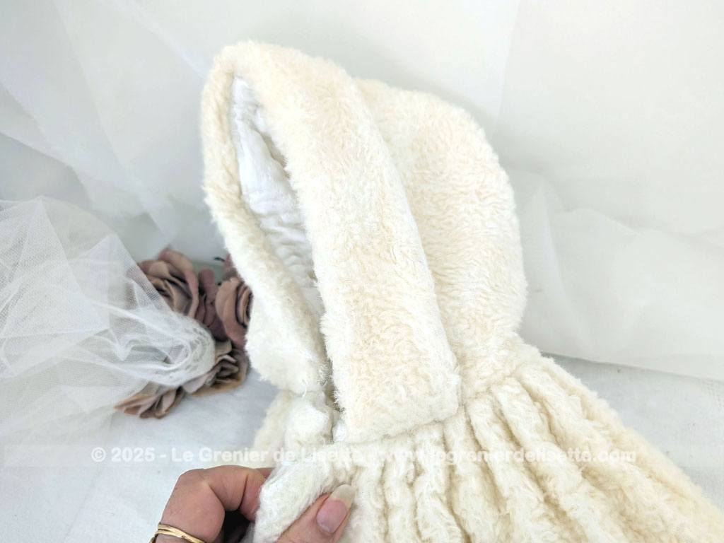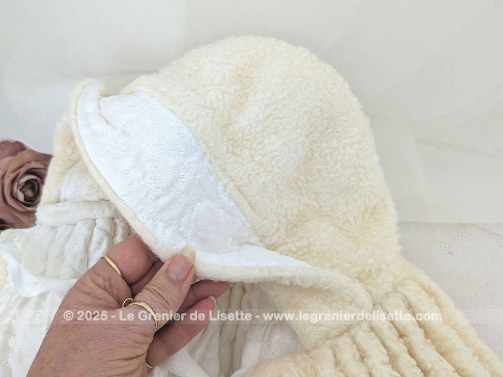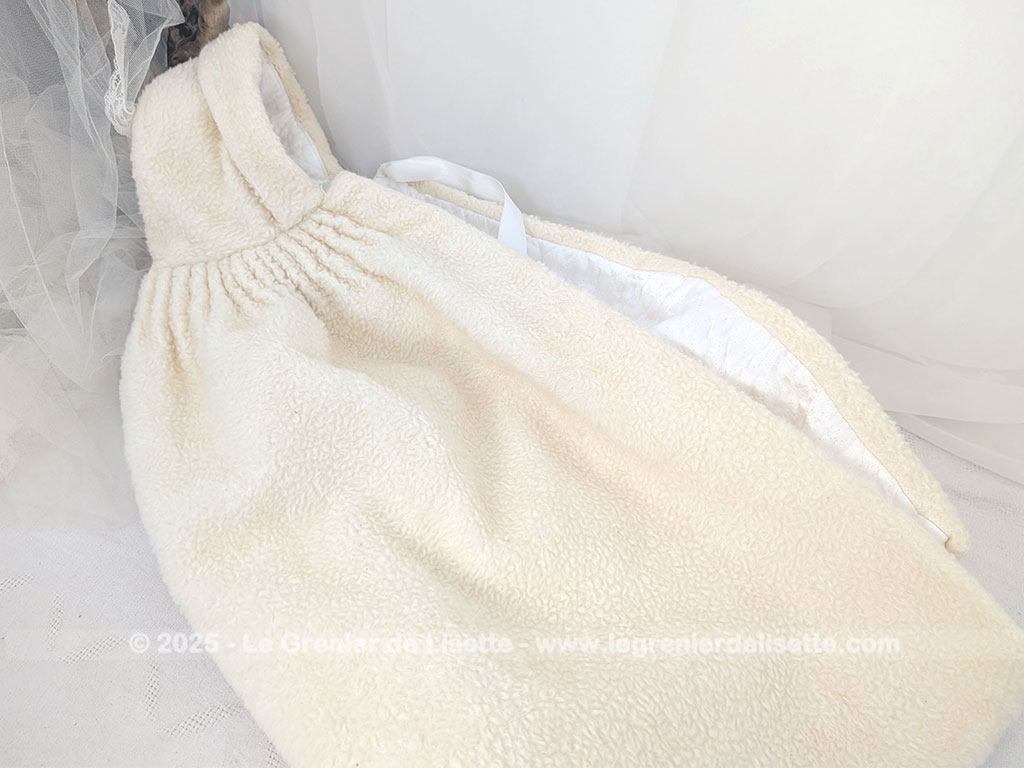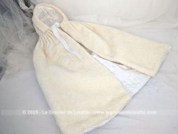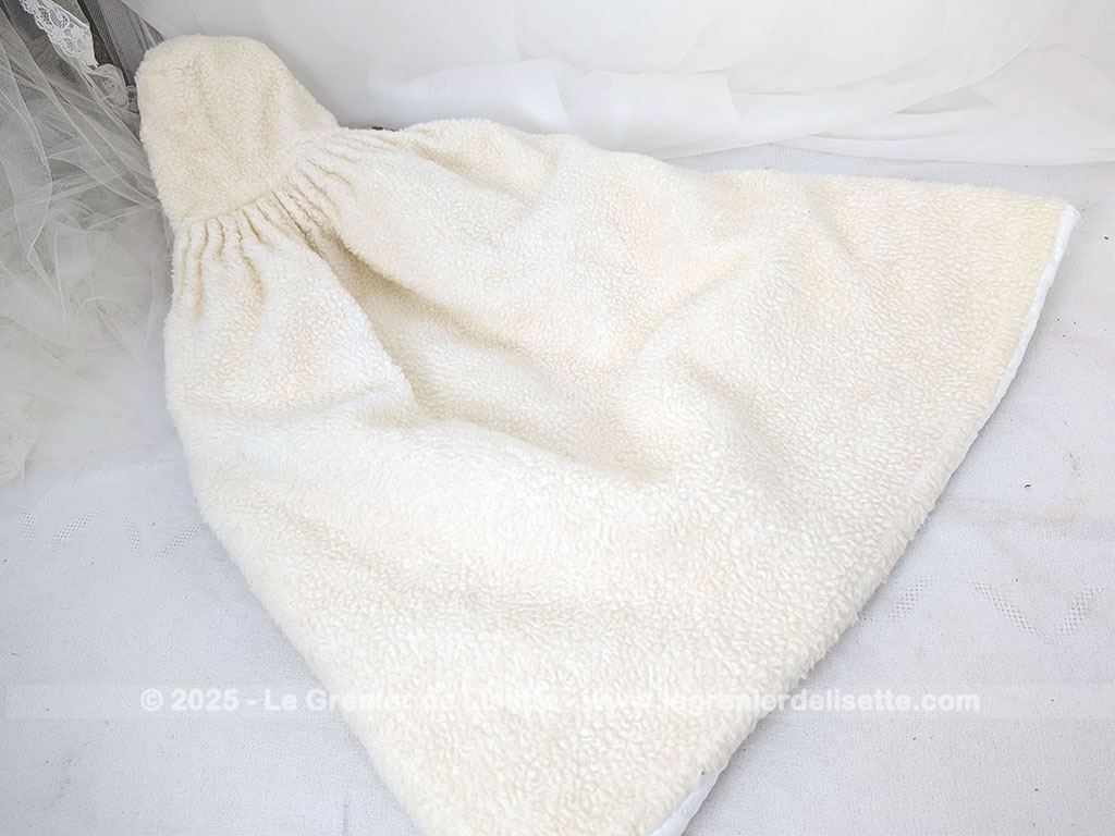 Fait main, voici un adorable burnous de baptême vintage, en tissu imitation mouton de couleur ivoire, au charme d’un autre temps. Il est entièrement doublé de satin blanc, ce qui lui donne une belle tenue et un contraste élégant. L’extérieur a un toucher un peu rêche pour le moment, simplement parce qu’il a été lavé sans adoucissant, mais cela n’enlève rien à sa beauté ni à sa douceur visuelle.