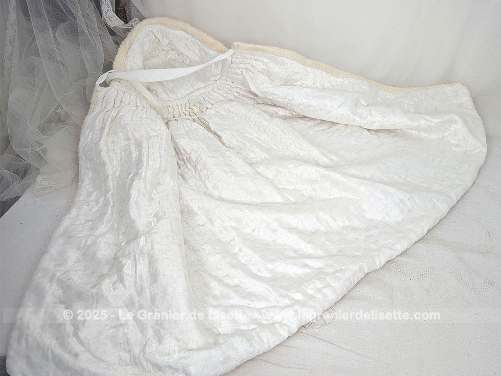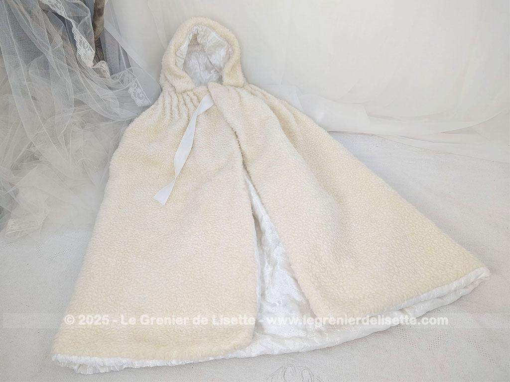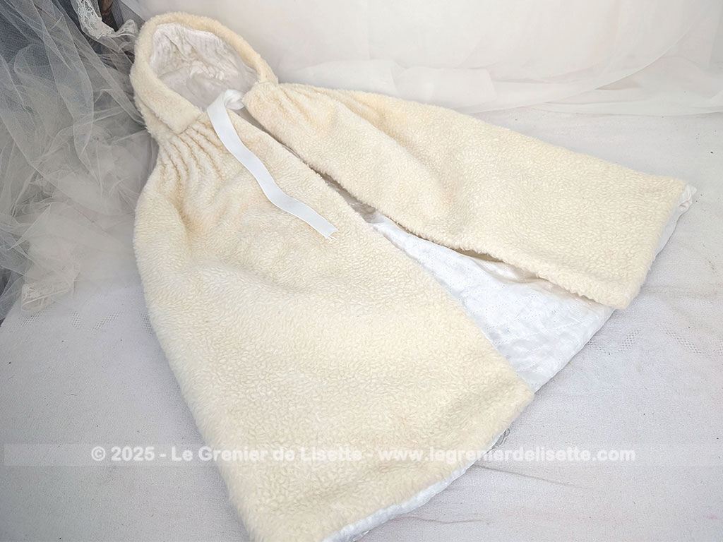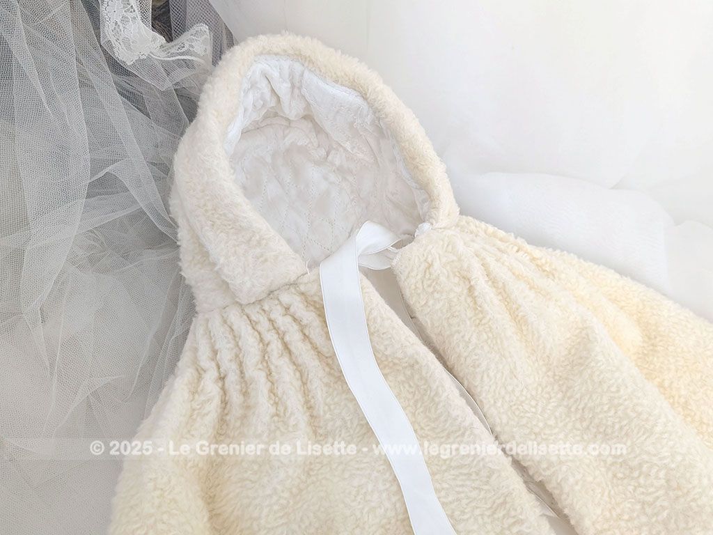 Fait main, voici un burnous de baptême vintage en imitation mouton ivoire, doublé de satin blanc. Capuche, plis cousus à l’encolure et liens à nouer. Une pièce rempli du charme authentique d’autrefois.