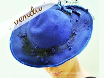 Chapeau en feutre bleu, entre le bibi et la capeline. Un noeud en satin et une voilette en plumetis bleu sur son pourtour. La voilette est de toute beauté mais fragilisée par le temps passé. Un ruban de velours avec un fer rigide sur son bord, permet de lui donner la forme désirée. A porter ou à poser sur un porte chapeau pour un des plus belles décorations. C’est toujours à vous de chosir !