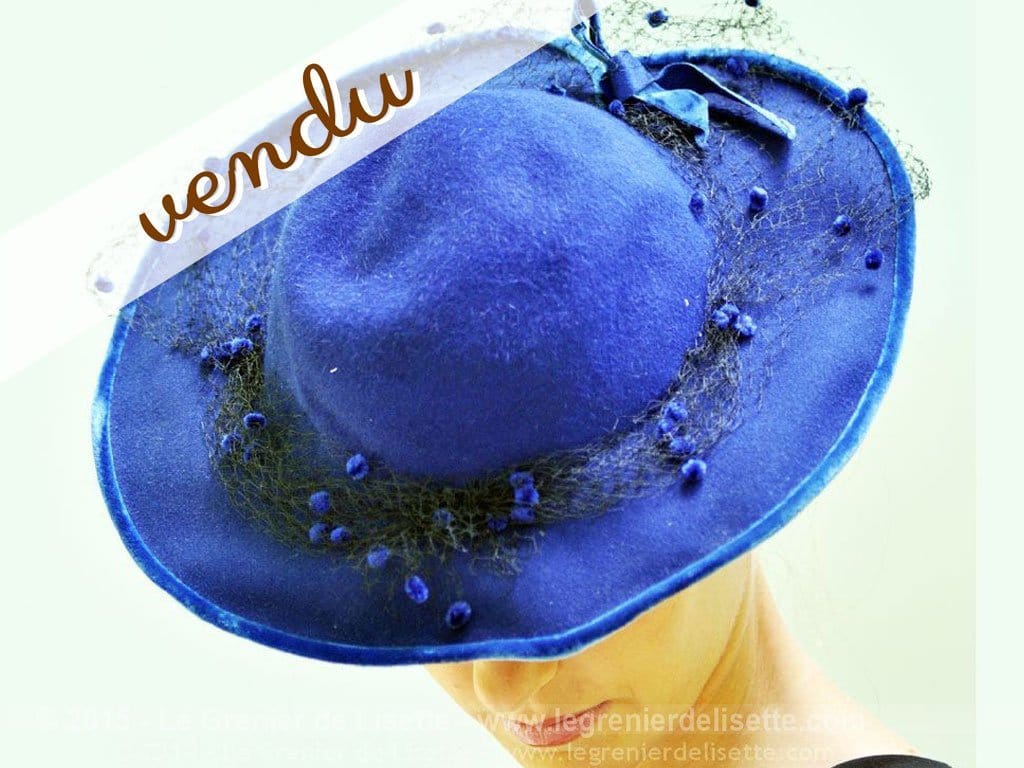 Chapeau en feutre bleu, moitie bibi/capeline avec voilette plumetis. Tour de tête 57/58 cm.