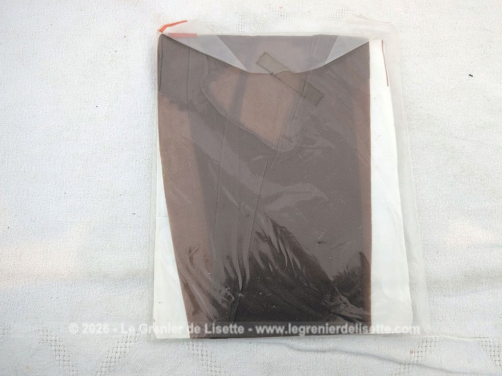 Voici un collant vintage de la marque Escapade « Spécial Mode Courte »en taille 4. Il daterait des années 70 avec la mention « 1er choix, extensible, extra fin et slip dentelle ». Au prix de « 3Frs 25 » à l’époque. Il est bien mentionné qu’il est de premier choix et qu’il possède un slip en dentelle ! La pochette de ce collant semble neuve et n’avoir jamais été ouverte. Et…. je ne l’ai pas ouverte non plus, donc je ne connais pas l’état du collant. Ce que je peux dire par contre, c’est que le collant est réellement beaucoup plus clair que sur les photos, plus caramel. La pochette mesure 19 x 23 cm.