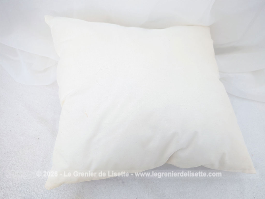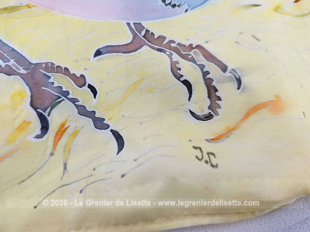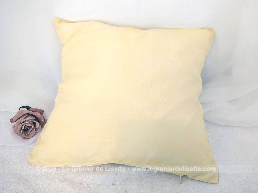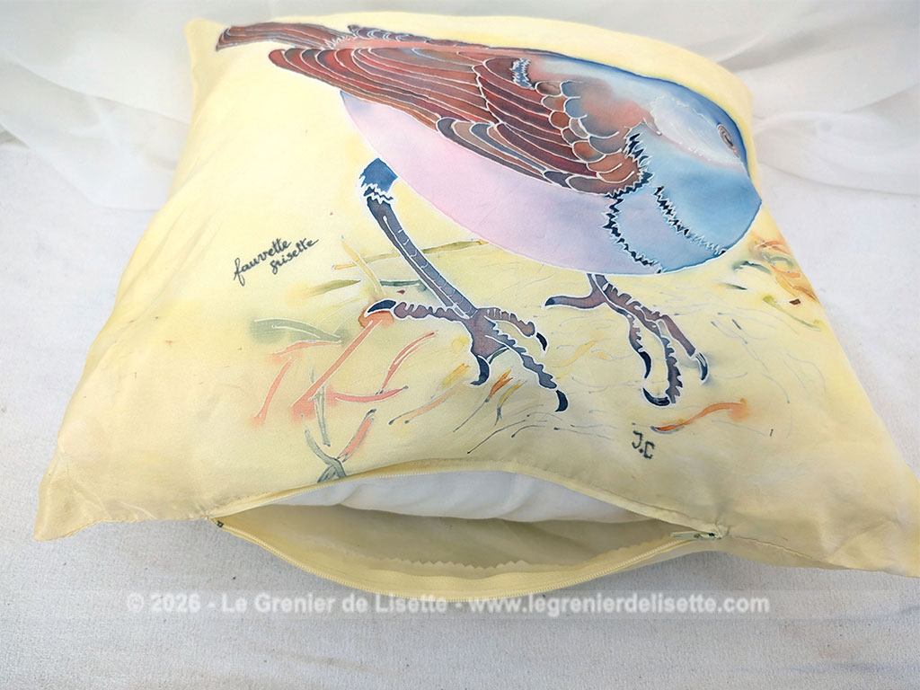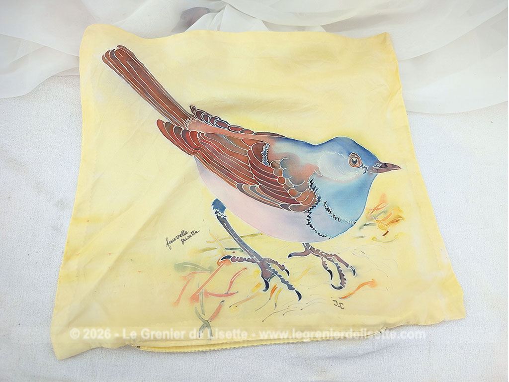 Fait main, voici un coussin de 38 x 40 cm  dont la partie décorative est en soie jaune poussin et décorée à la main du dessin d’un oiseau, une fauvette grisette et signé des initiale JC. Déhoussable avec une fermeture éclair sur un coté.