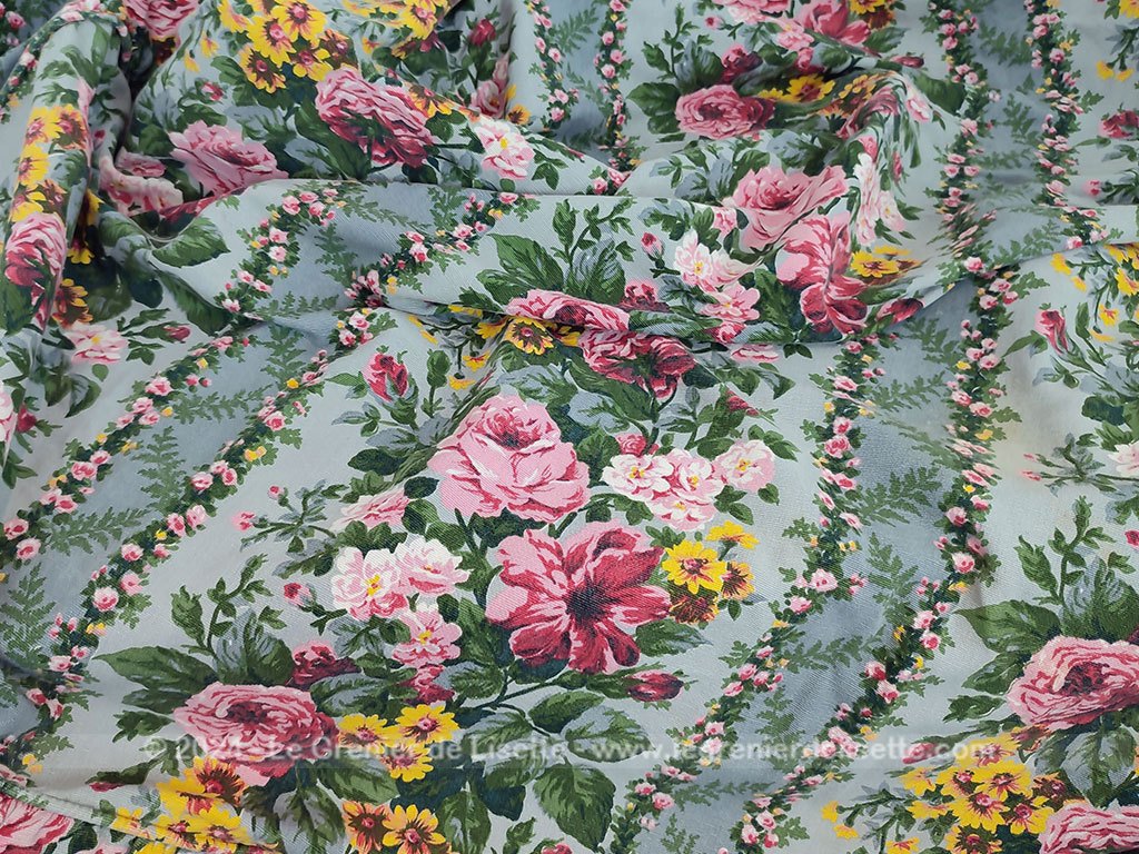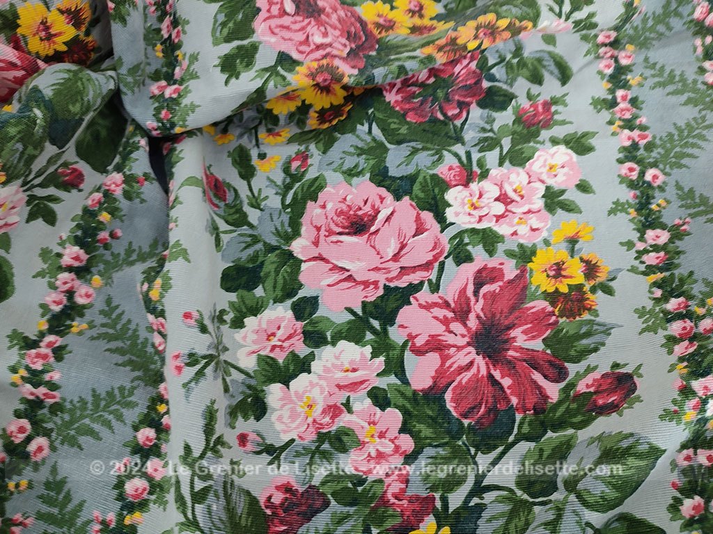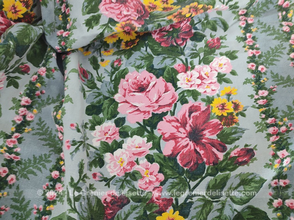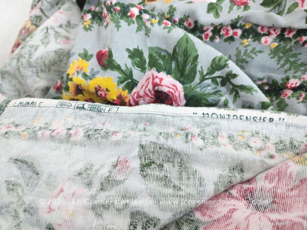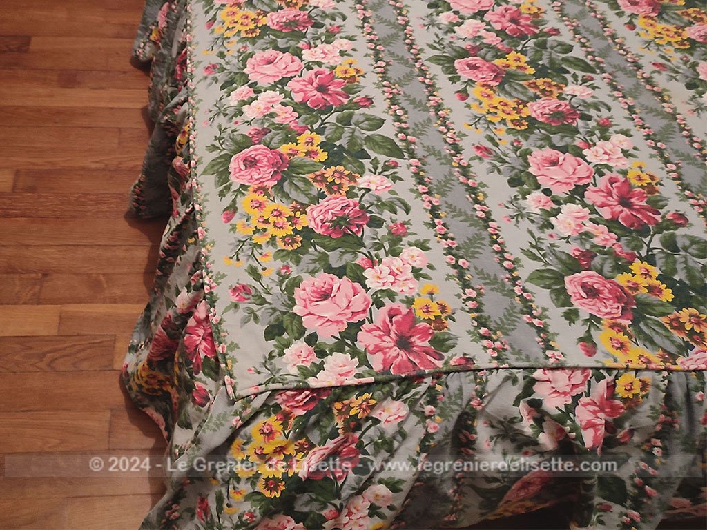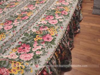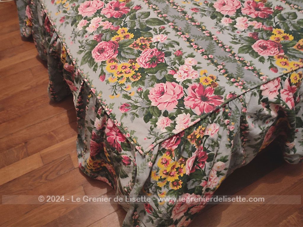 Voici un beau travail artisanal pour ce couvre-lit réalisé dans un superbe tissus d’ameublement de cotonnade modèle « Montpensier », reconnaissable à son imprimé de bouquets de fleurs roses et de fleurs des champs jaunes aux tons romantiques. Le fond du tissus est couleur vert d’eau tandis qu’un large volant généreusement froncé habille les côtés du lit avec un tombé impeccable. Il mesure 185 cm de long dont 25 cm pour l’arrondi du traversin sur 112 cm de large.  Il y a aussi 38 cm de volants sur trois cotés qui suivent les arrondis. L’intérieur de la partie arrondi pour le traversin est habillé par un autre tissus plus épais et coloré (voir photo).