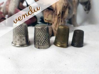 Voici quatre dès à coudre, certains très anciens, de matériaux, tailles et dessins différents. Inox, fer, cuivre, laiton et régule ! De 2 cm à 1 cm de diamètre… Une décoration originale …