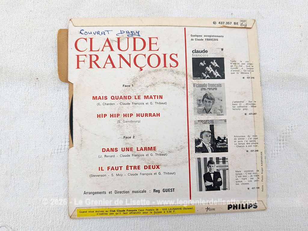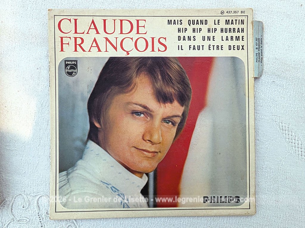 Voici un disque 45T Claude François  des années 60 avec 4 titres, dont le plus célèbre est « Mais quand le matin ». Belle pochette de disque  avec photo sur carton glacé avec mention d’un nom au dos. Il y a quelques traces du temps passé mais un disque en bon état, prêt à être écouté