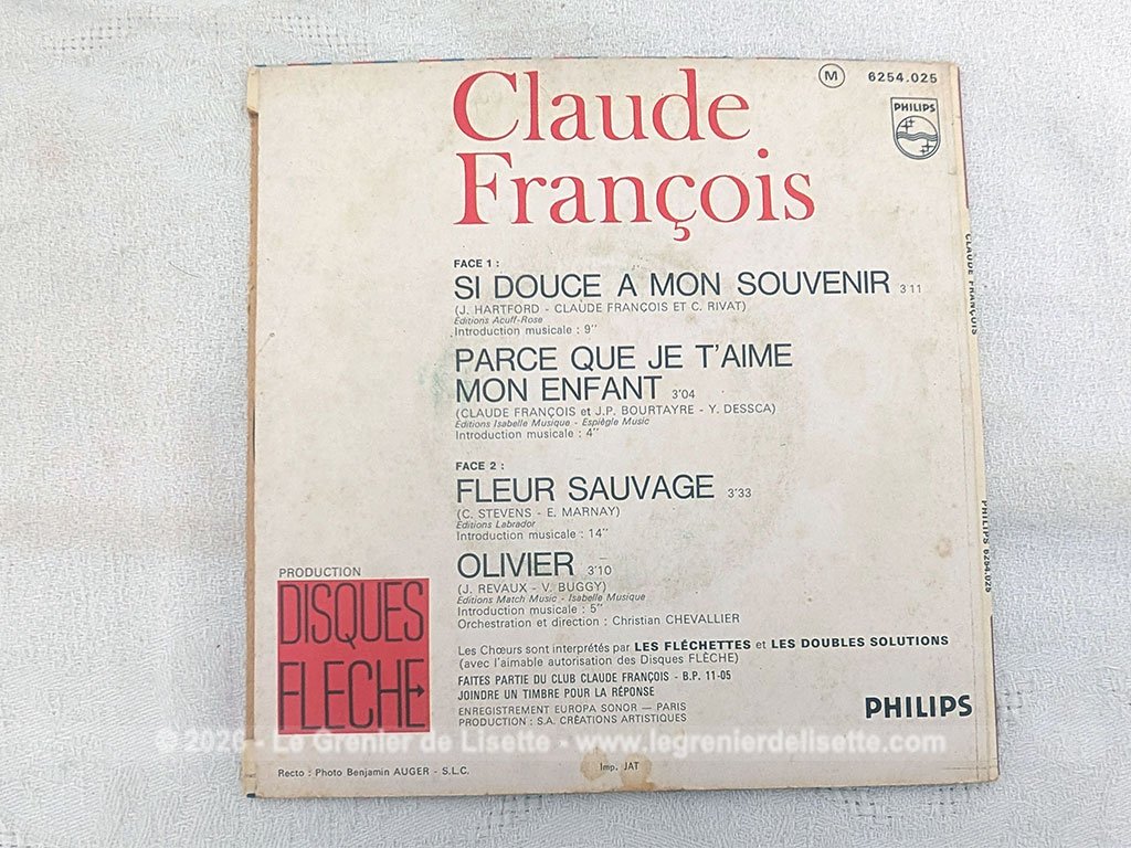 Voici un disque 45T Claude François des années 70 avec 4 titres, dont le plus célèbre est « Si douce à mon souvenir ». Belle pochette de disque avec photo sur carton glacé. Il y a quelques traces du temps passé au dos mais un disque en bon état, prêt à être écouté.