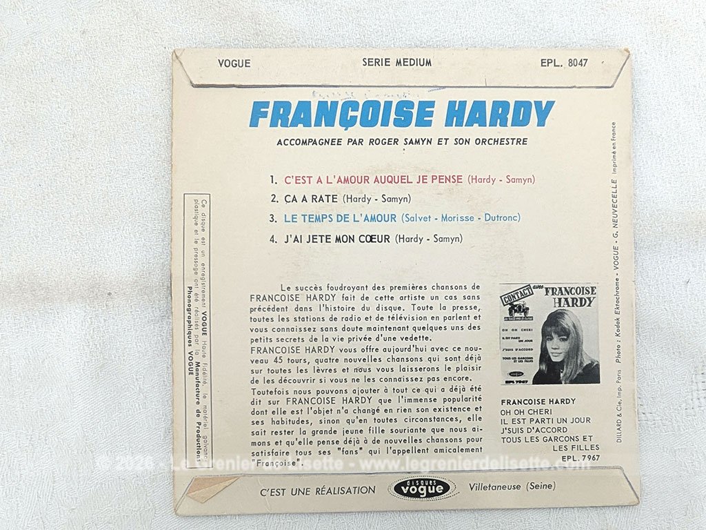 Voici un disque 45T de Françoise Hardy des années 60 avec 4 titres, dont le plus célèbre est « C’est à l’amour auquel je pense ». Belle pochette de disque sur papier carton brillant avec photo avec un nom manuscrit au dos. Il y a de très légères traces du temps passé avec un disque en bon état, prêt à être écouté.