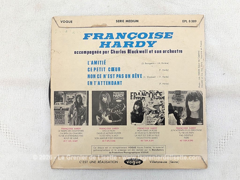 Voici un disque 45T de Françoise Hardy des années 60 avec 4 titres, dont le plus célèbre est « L’Amitié ». Belle pochette de disque sur papier carton brillant avec photo sans nom manuscrit au dos. Il y a de très légères traces du temps passé avec un disque en bon état, prêt à être écouté.