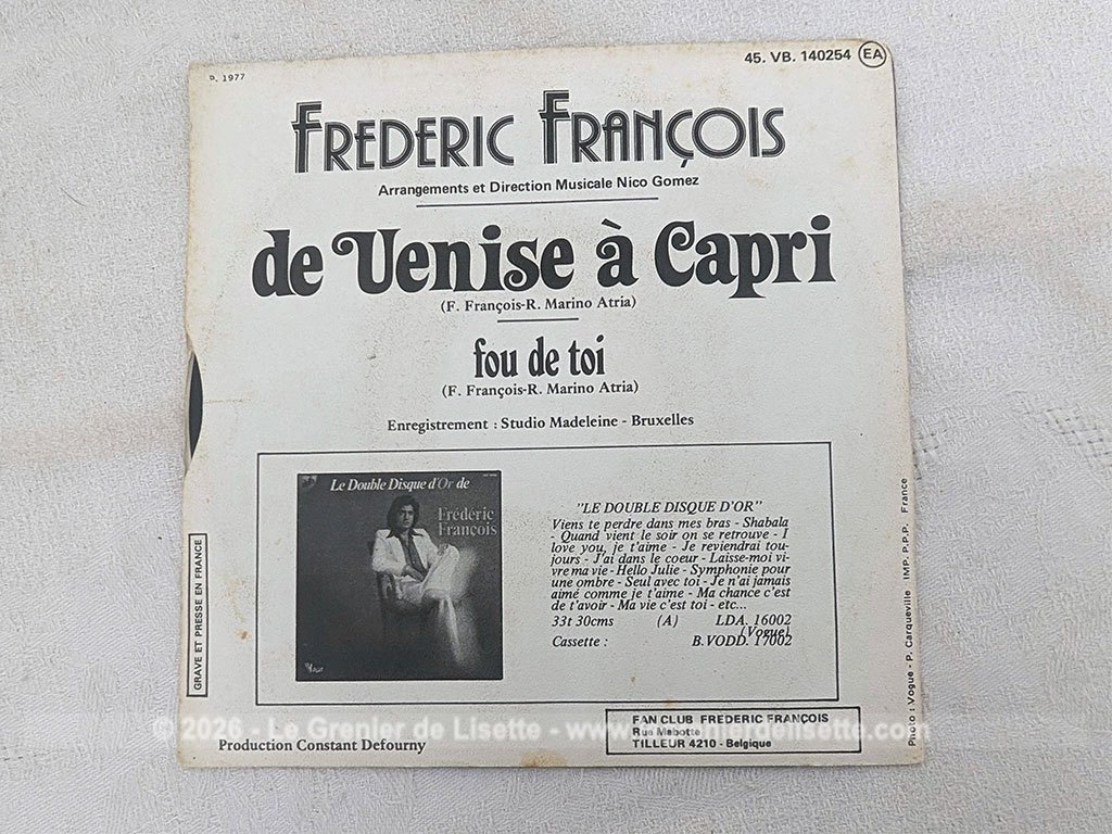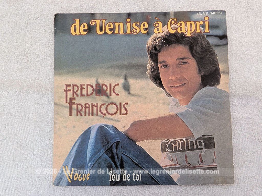 Voici un disque 45T de Frédéric François  des années 70 avec 2 titres, dont le plus célèbre est « De Venise à Capri ». Belle pochette de disque  avec photo sur carton et sans  annotation manuscrite. Il y a quelques traces du temps passé mais un disque en bon état, prêt à être écouté