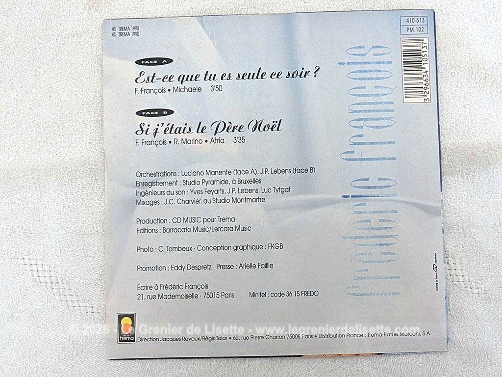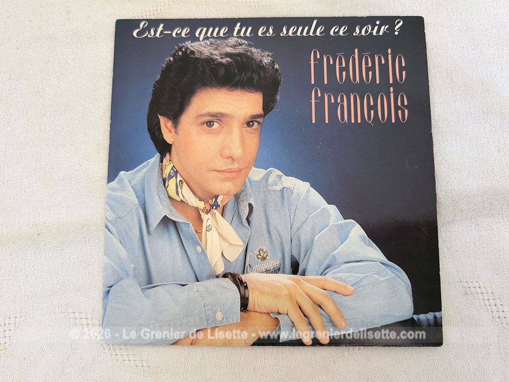 Voici un disque 45T de Frédéric François des années 90 avec 2 titres, dont le plus célèbre est « Est ce que tu es seule ce soir ». Très belle pochette de disque avec photo sur carton et sans annotation manuscrite. Il y a à peine quelques traces du temps passé mais un disque en bon état, prêt à être écouté
