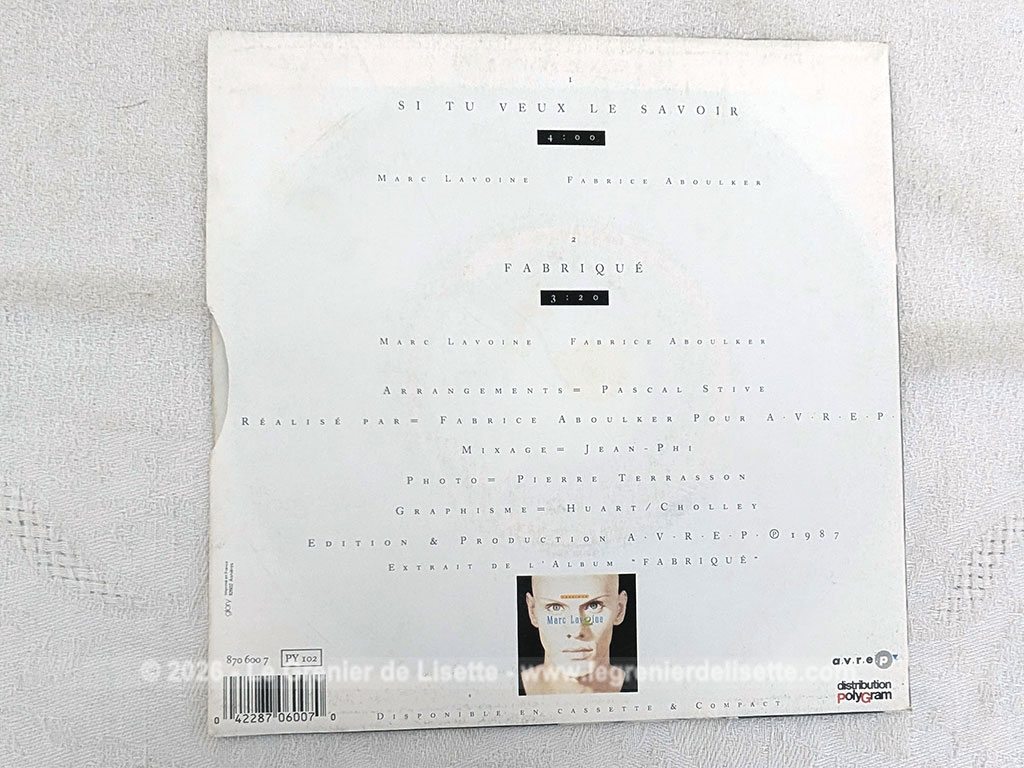 Voici un disque 45T de Marc Lavoine de 1988 avec 2 titres, dont le titre phare est « Si tu veux le savoir ». Très belle pochette de disque sur papier carton de qualité sans nom manuscrit au dos. Il y a de très légères traces du temps passé avec un disque en bon état, prêt à être écouté.