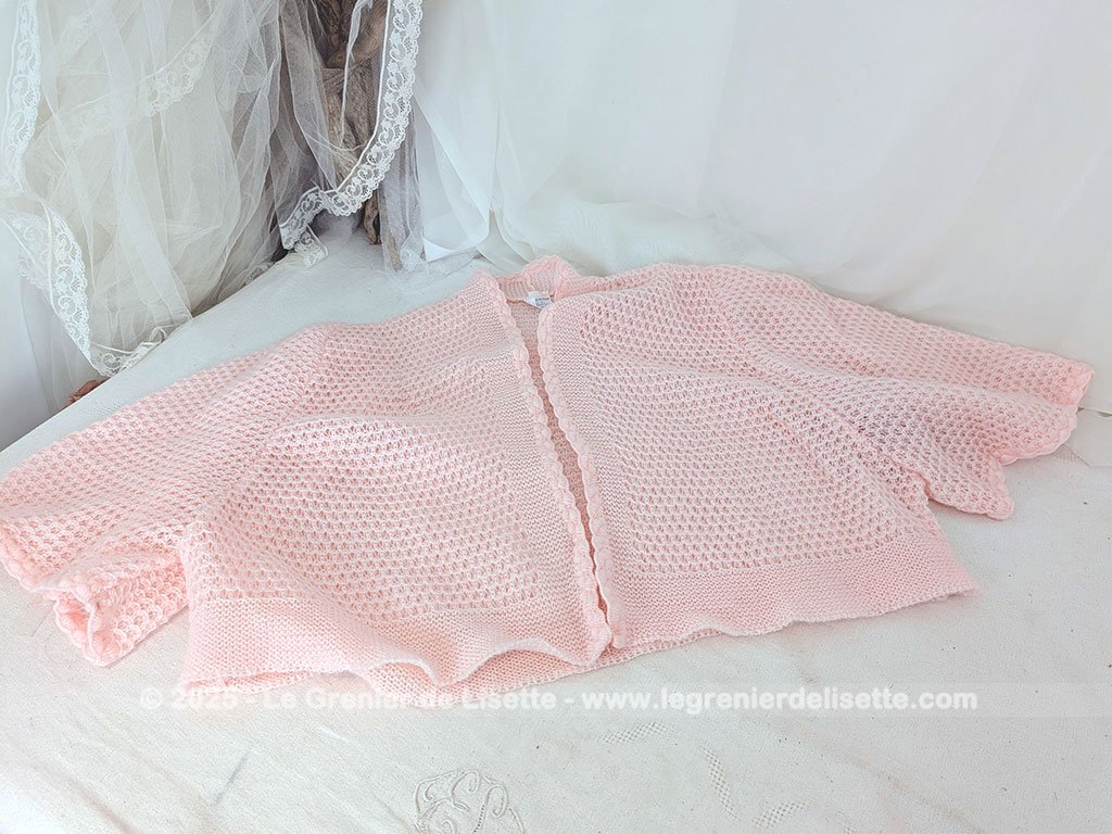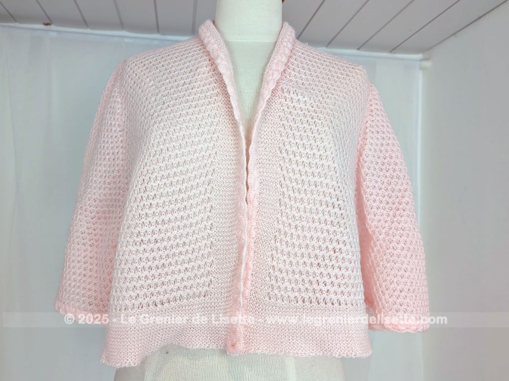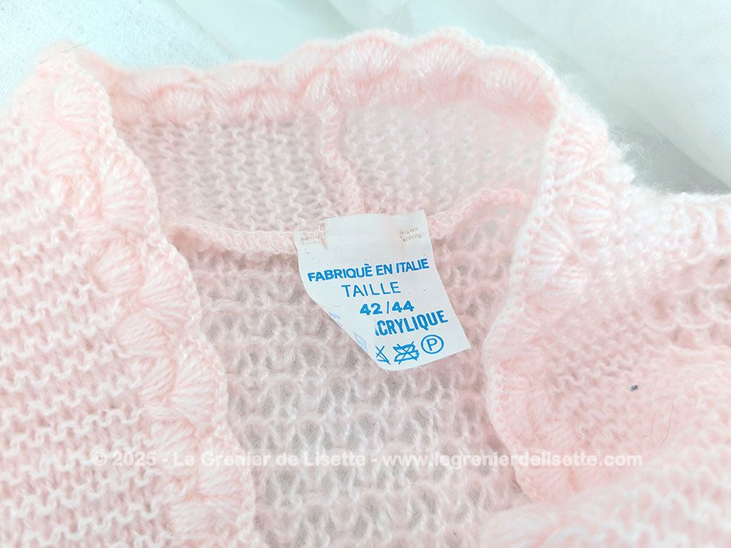 Que de charme dans cette superbe et douce liseuse en laine fibre acrylique rose pâle, Made in Italie, aux manches chauve-souris. Elle daterait du début des années 2000. Sa conception et sa longueur seront parfaites pour couvrir vos bras. Elle se tient ouverte pour des mouvements aisés et n’a pas de liens qui serrent à l’encolure. Il y a une étiquette qui mentionne « Fabriqué en Italie » « Taille 42/44 » « Fibre Acrylique ». D’apres les mesures, ce serait plus une taille 40/42. Ses deux manches amples forme « Chauve Souris » s’adapteront à presque toutes les morphologies. Elle sera parfaite le soir au coin du feu…