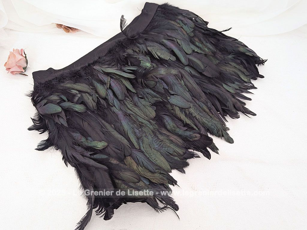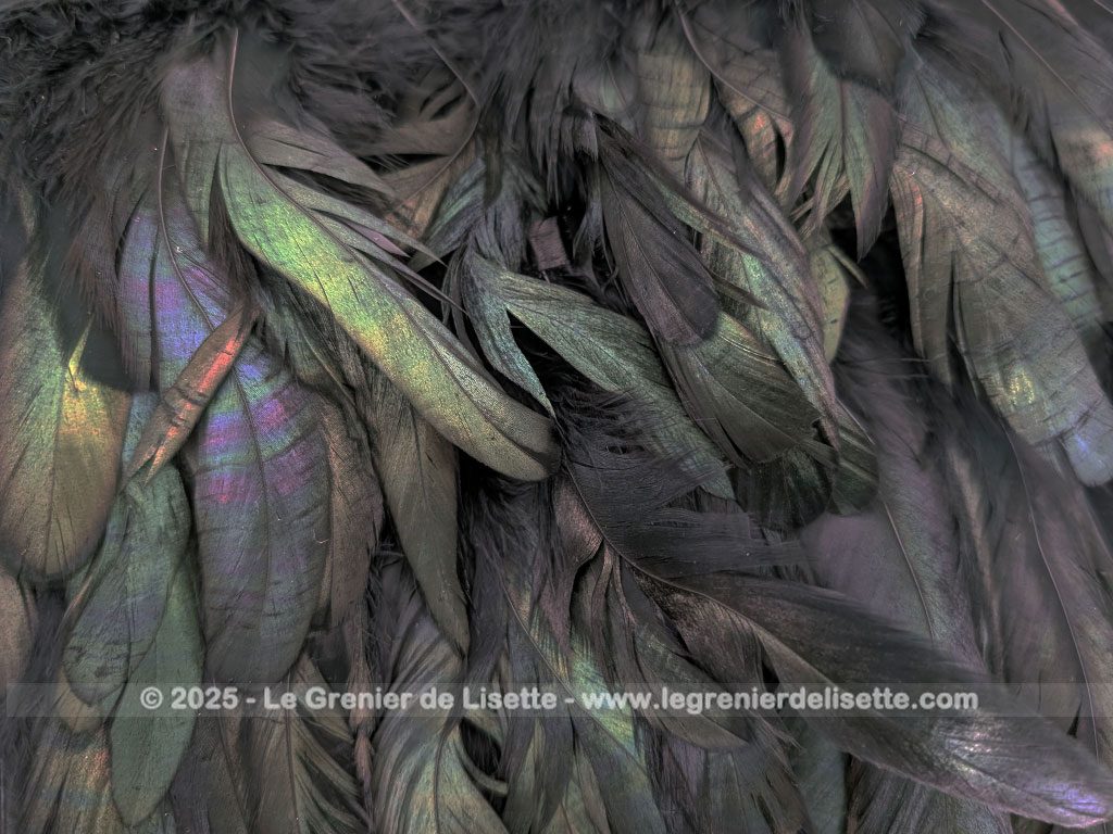 Mystérieuse, vibrante, fascinante… voici une jupe aussi spectaculaire qu’inattendue, entièrement composée de plumes naturelles noires aux reflets irisés, oscillant entre vert profond et bleu nuit selon la lumière. Chaque plume semble déposée avec soin, captant la lumière pour habiller le corps d’un voile de légèreté animale, évoquant à la fois le mystère des oiseaux exotiques et le glamour des tenues de scène. Que ce soit pour un shooting, une soirée costumée, une création artistique ou tout simplement pour sublimer un style affirmé : cette jupe est un véritable coup d’éclat. Elle mesure 40 cm de haut (suivant les plumes) et 45 cm à plat et se ferme par une fermeture éclair.