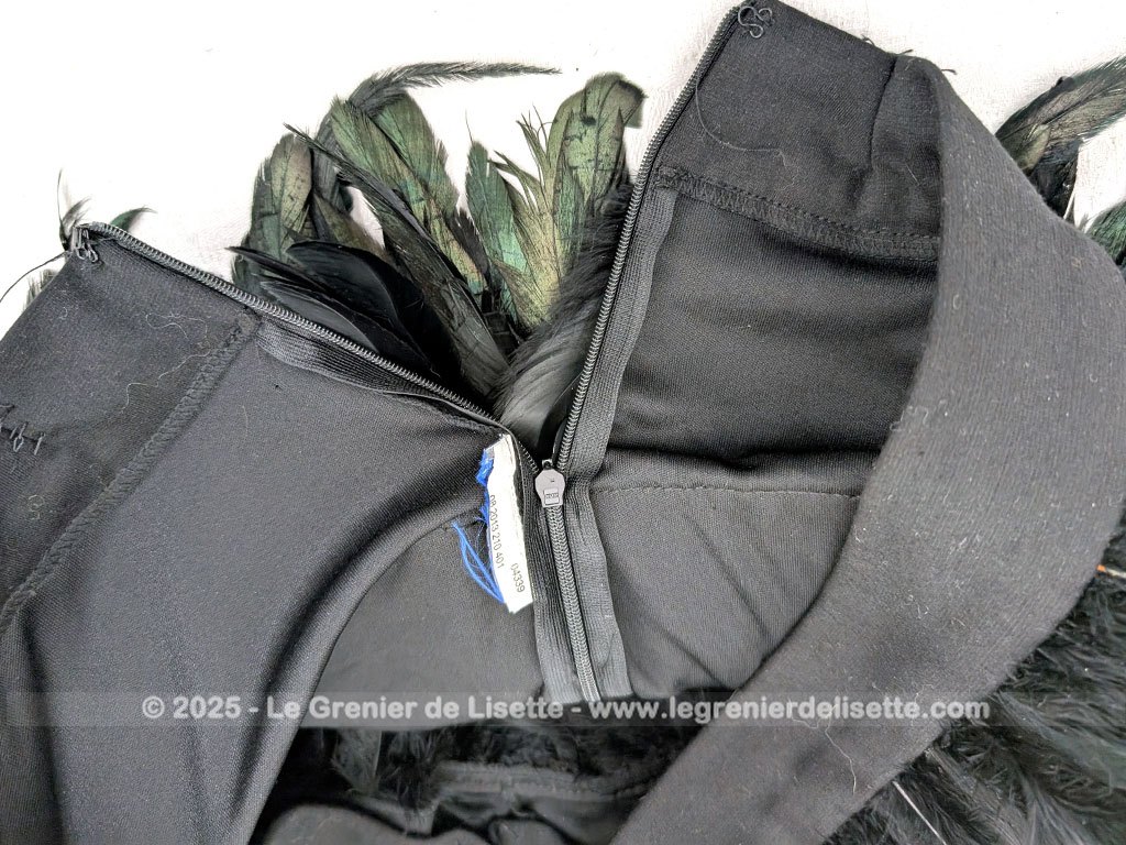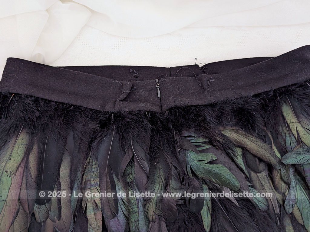 Taille 42/44, voici une belle jupe courte, élégante et théâtrale à la fois, toute en plumes noires aux reflets irisés, portant l’étiquette de la marque française reconnue pour ses créations audacieuses « Ici et Maintenant ».