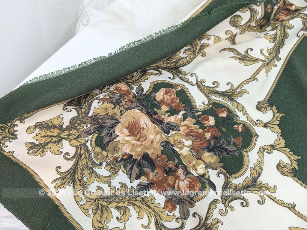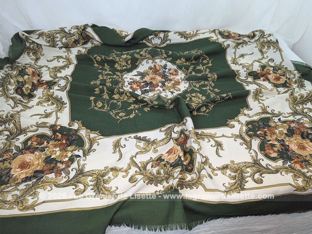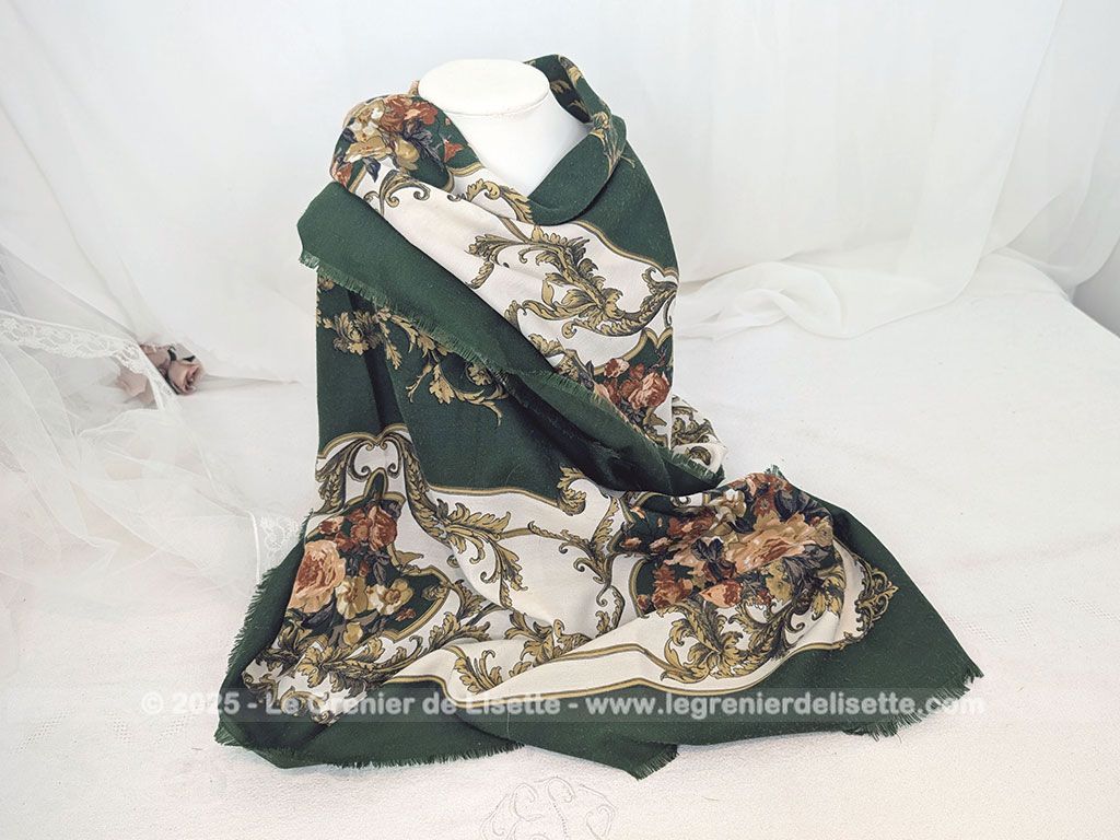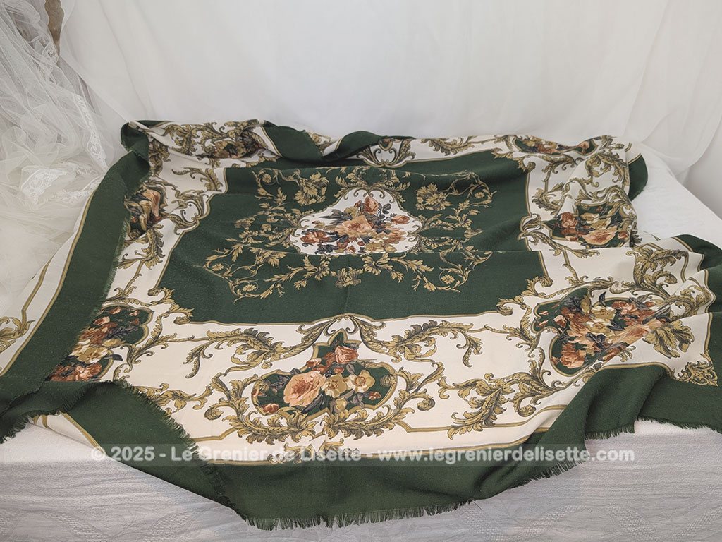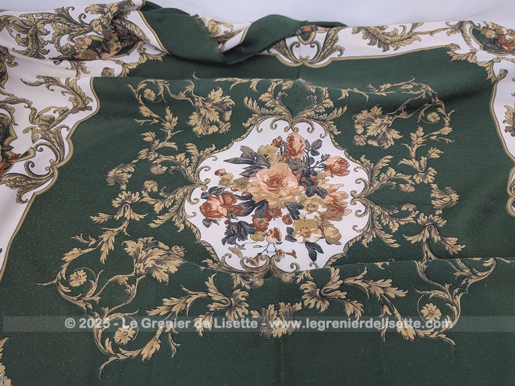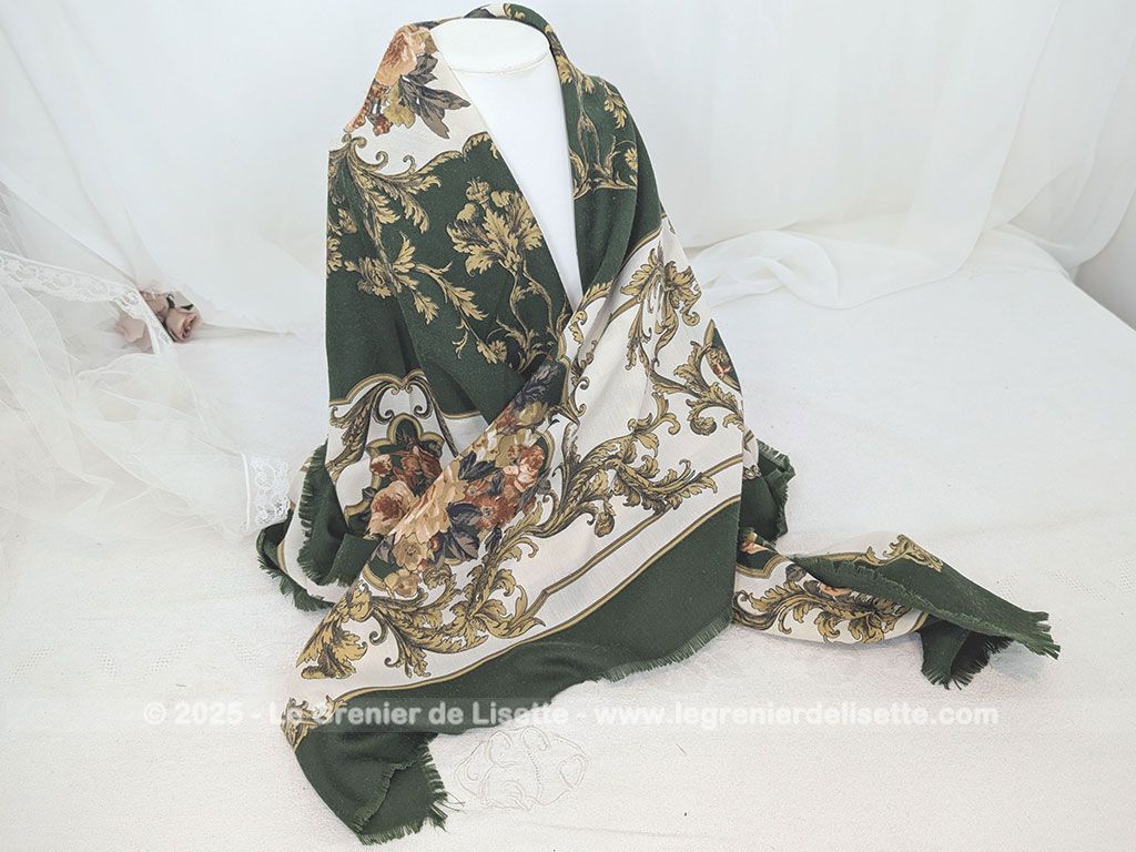 Voici une pièce raffinée venue d’Italie avec ce grand foulard de 115 x 115 cm vert sapin et ses motifs baroques encadrant des bouquets de fleurs aux tons automnaux. Idéal pour apporter une petite touche en plus à votre tenue.