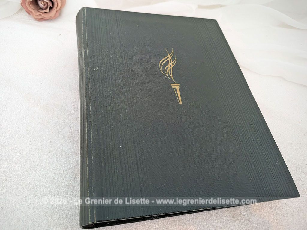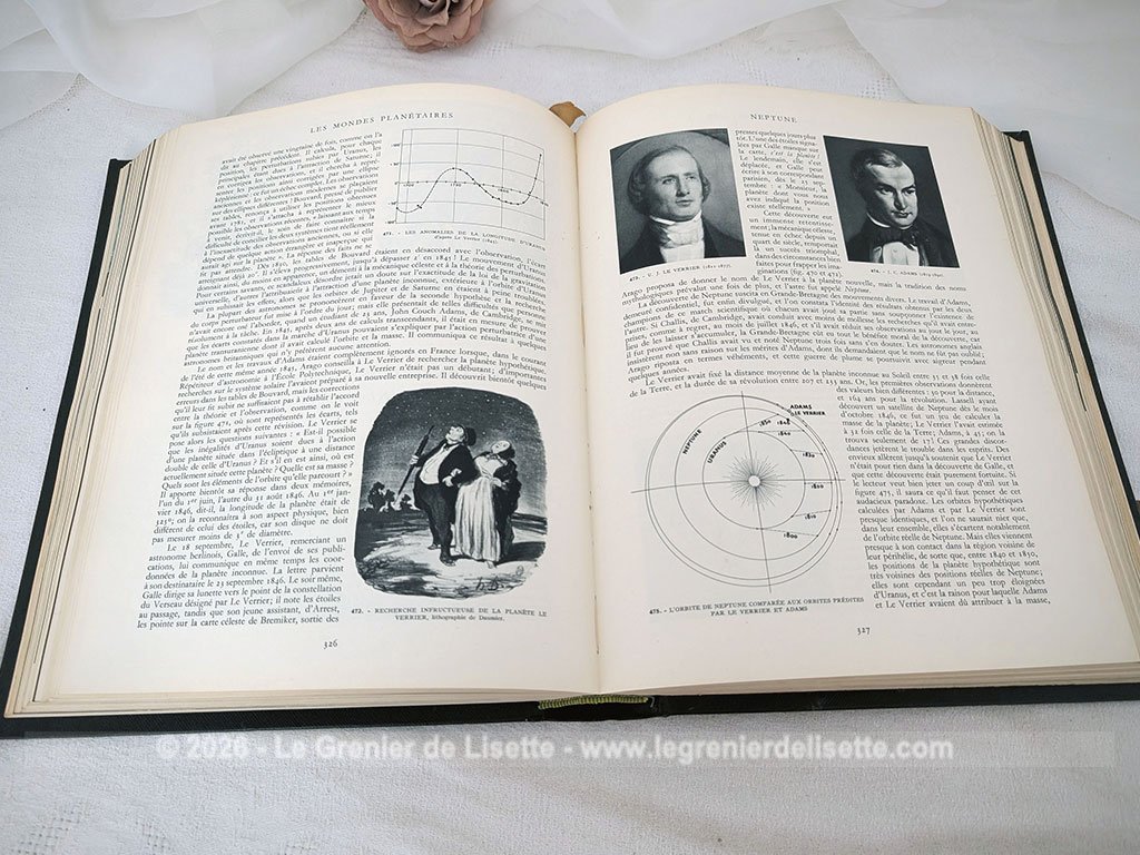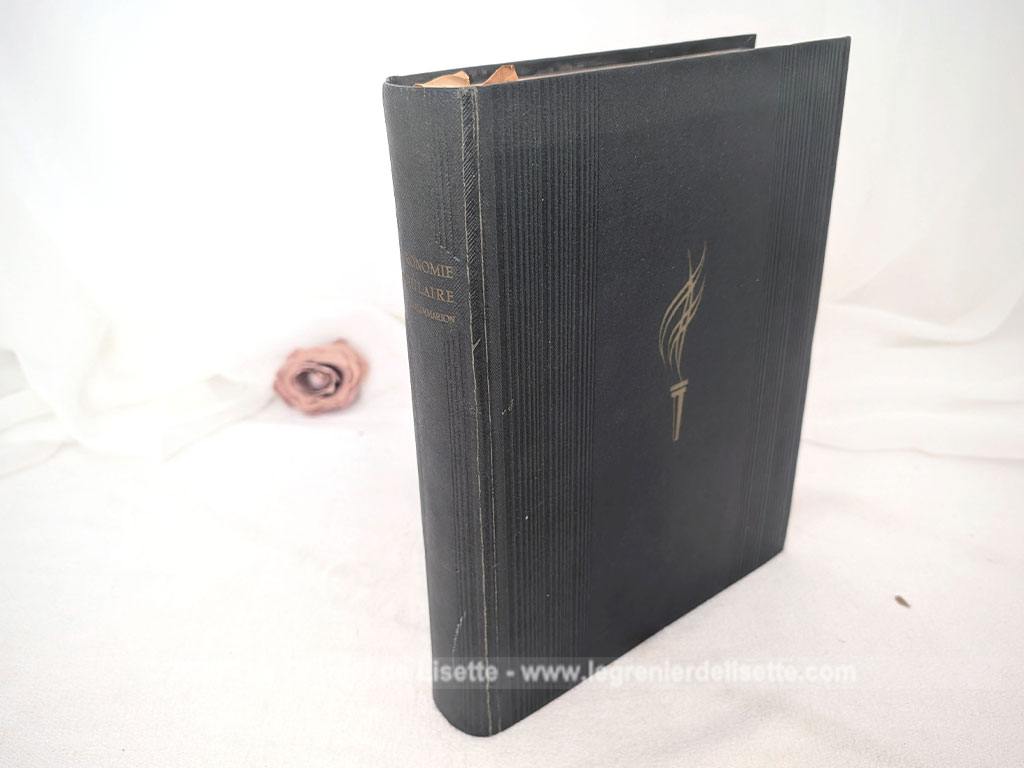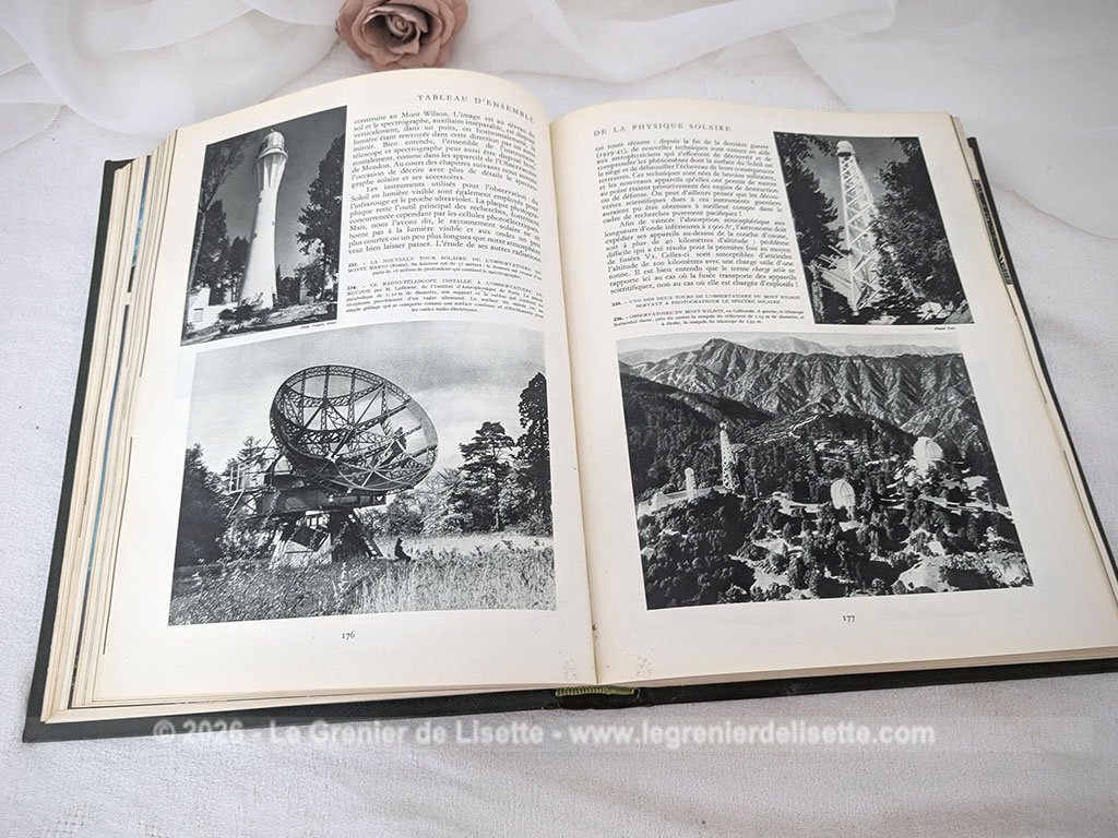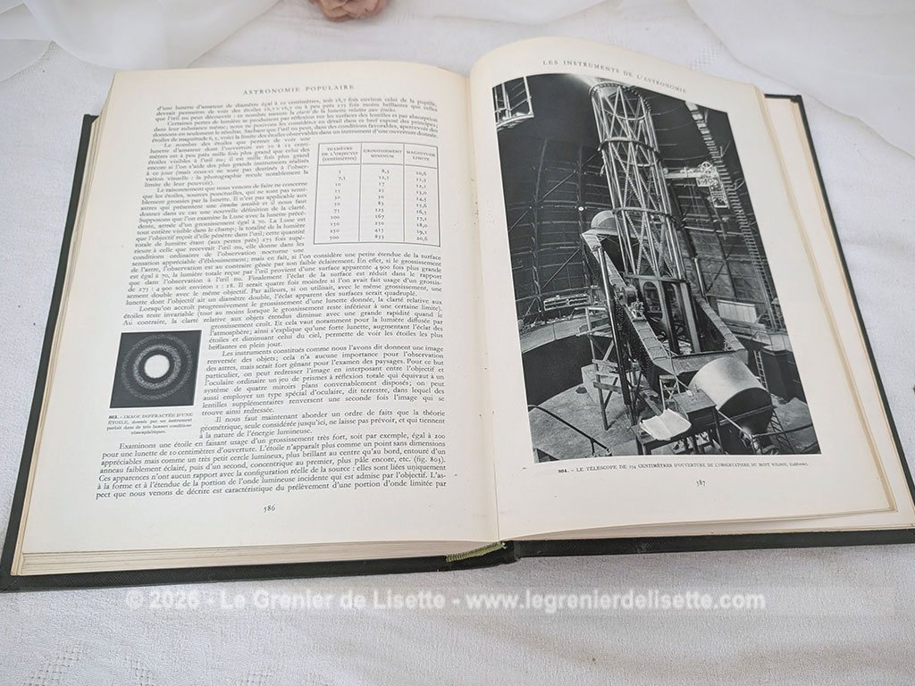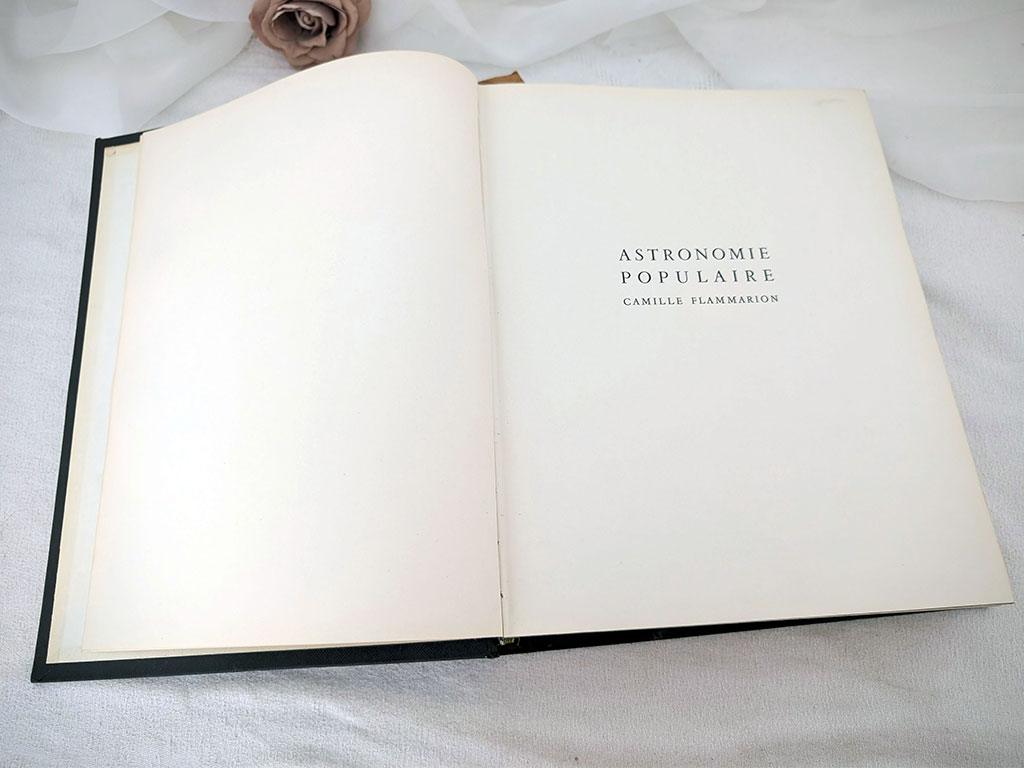 Voici une édition de 1955 du célèbre livre Astronomie Populaire de Camille Flammarion, un ouvrage encyclopédique de référence de 610 pages publié sous la direction de Gabrielle Camille Flammarion et André Danjon. Ce volume mesure de 22.5 cm par 29 cm et 4.5 cm de large et pèse plus d’un kilo. On découvre une exploration complète de la voûte céleste à travers des chapitres détaillés sur la Terre, la Lune, le Soleil et les systèmes planétaires, le tout illustré par de nombreuses planches hors-texte et des cartes précises. En effet, la multitude d’illustrations, de magnifiques photos et de gravures d’époque en fait un outil de savoir fascinant et très décoratif. Sans oublier sur la dernière page de couverture et bien protégé, la présence d’un grand planisphère céleste dépliant en couleurs. Avec une belle et robuste reliure pleine en percaline vert foncé décoré d’une torche dorée, cet exemplaire en très bel état est prêt à rejoindre une bibliothèque de passionnés du ciel ou les « mordus » du savoir !