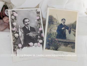 Voici un lot de 2 cartes postales anciennes pour fêter le 1er Avril, datant du tout début du siècle dernier représentant la photo sur papier glacé d’un homme avec des poissons et sa petite maxime au ba… et au dos, de petits messages.