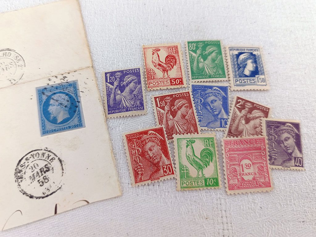 Voici un lot d’anciens timbres français. Il y a 11 timbres de différentes valeurs qui n’ont pas été non oblitérés, bien qu’il y a des traces de collage sur une enveloppe. Il y aussi un timbre à l’effigie de Napoléon III oblitéré en date du 20 mars 1858, toujours collé sur un morceau d’enveloppe. Pour collectionneur, pour débuter ou tout simplement pour se faire plaisir.