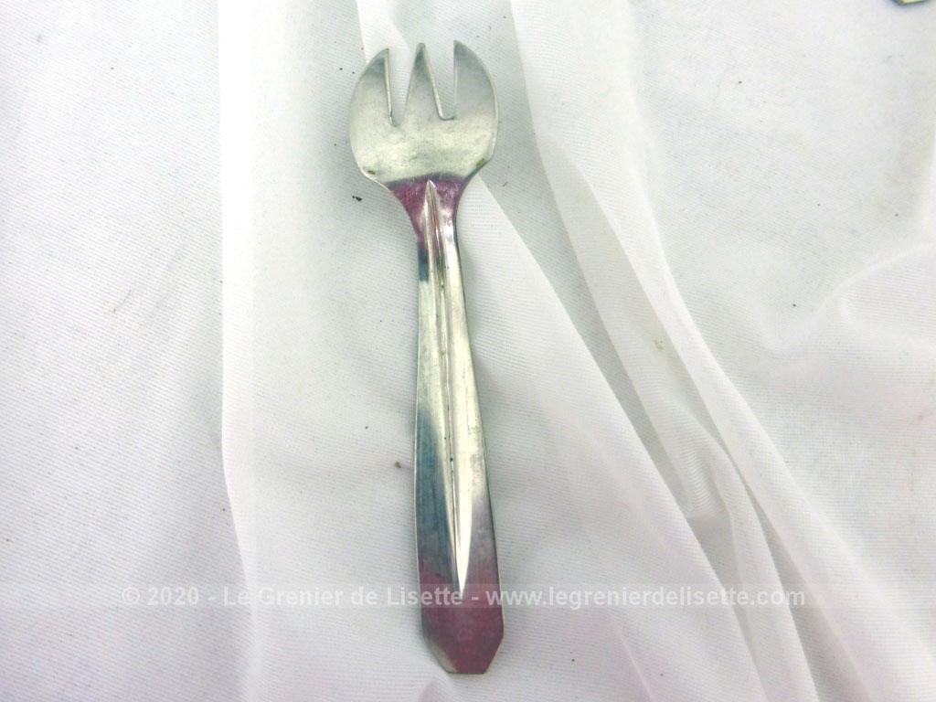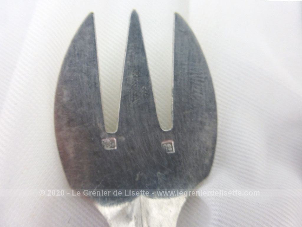 Voici un lot de 10 fourchettes vintages très légères en métal argenté à 3 dents pour dessert ou huitres, avec deux poinçons , un « Métal Argent » et l’autre « 12 ».
