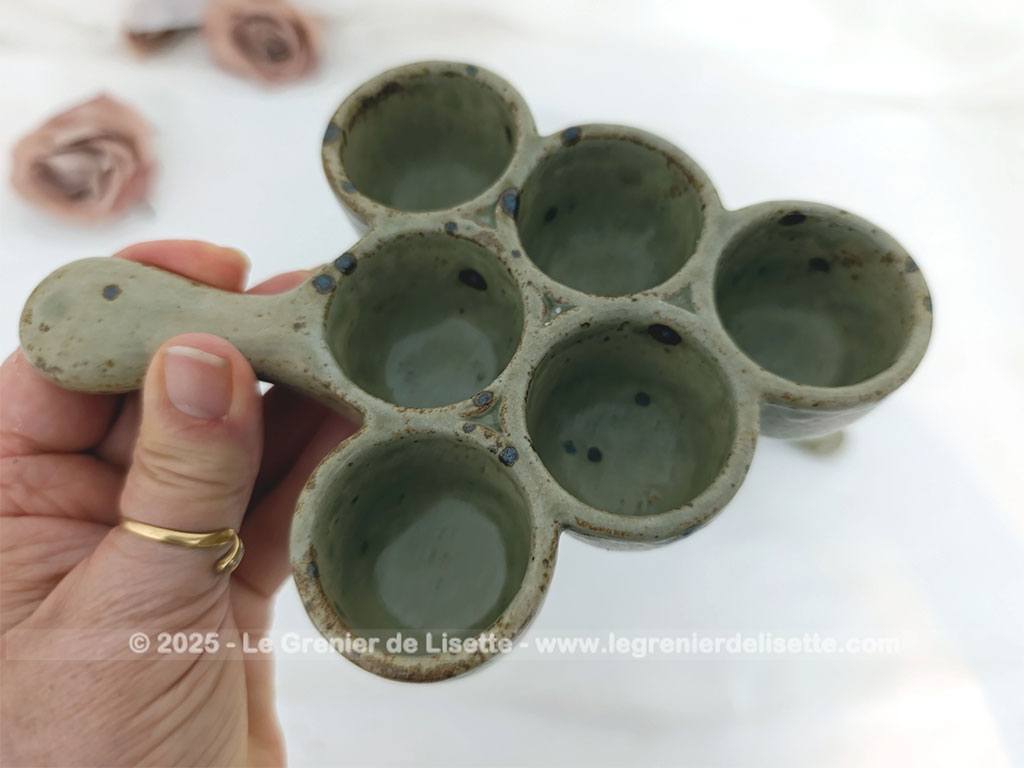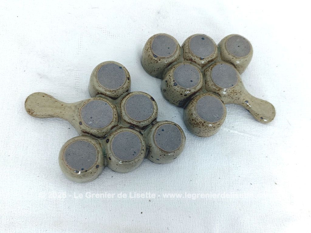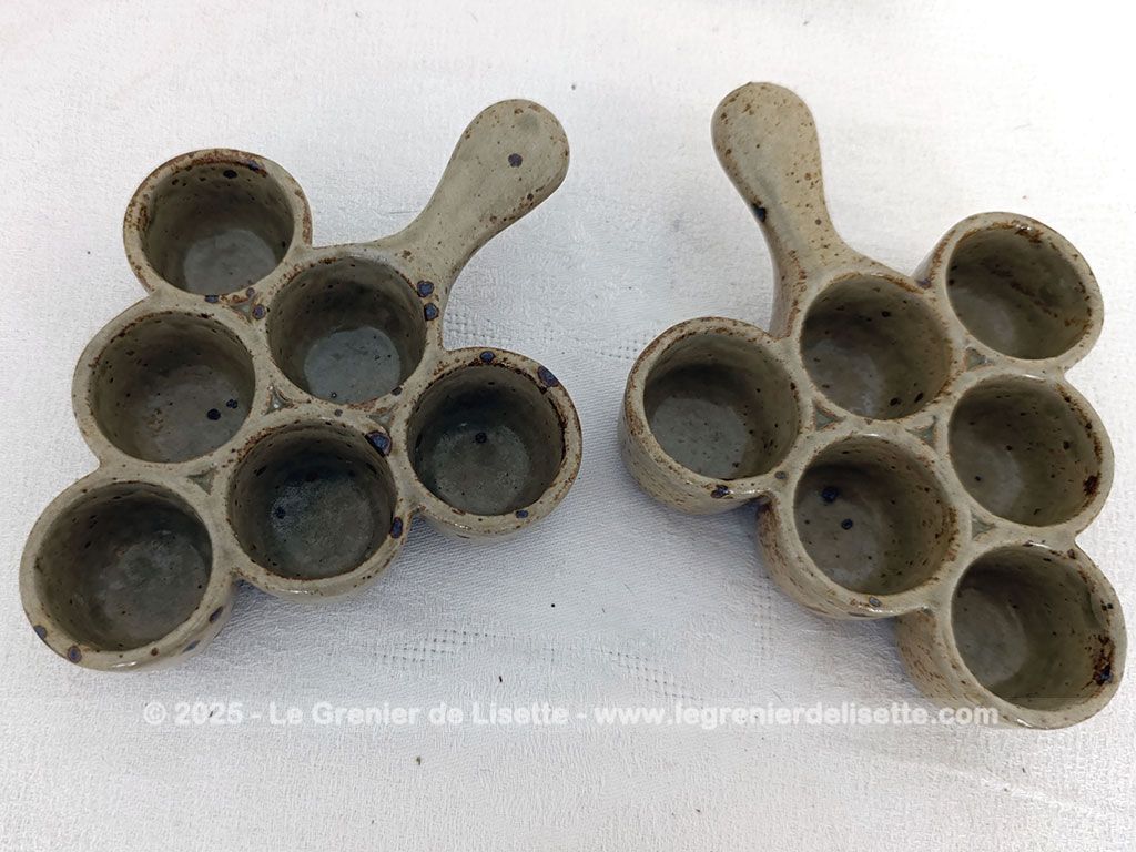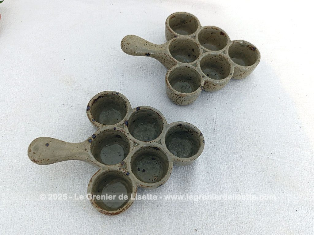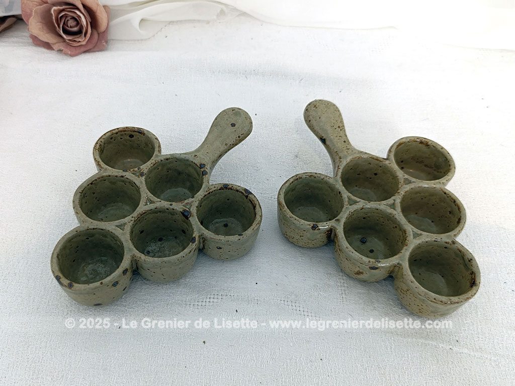 En grès émaillée, voici un lot de 2 plats vintages de présentation avec 6 emplacements. Idéal pour escargots, petits oeufs ou autres idées culinaires de décoration.