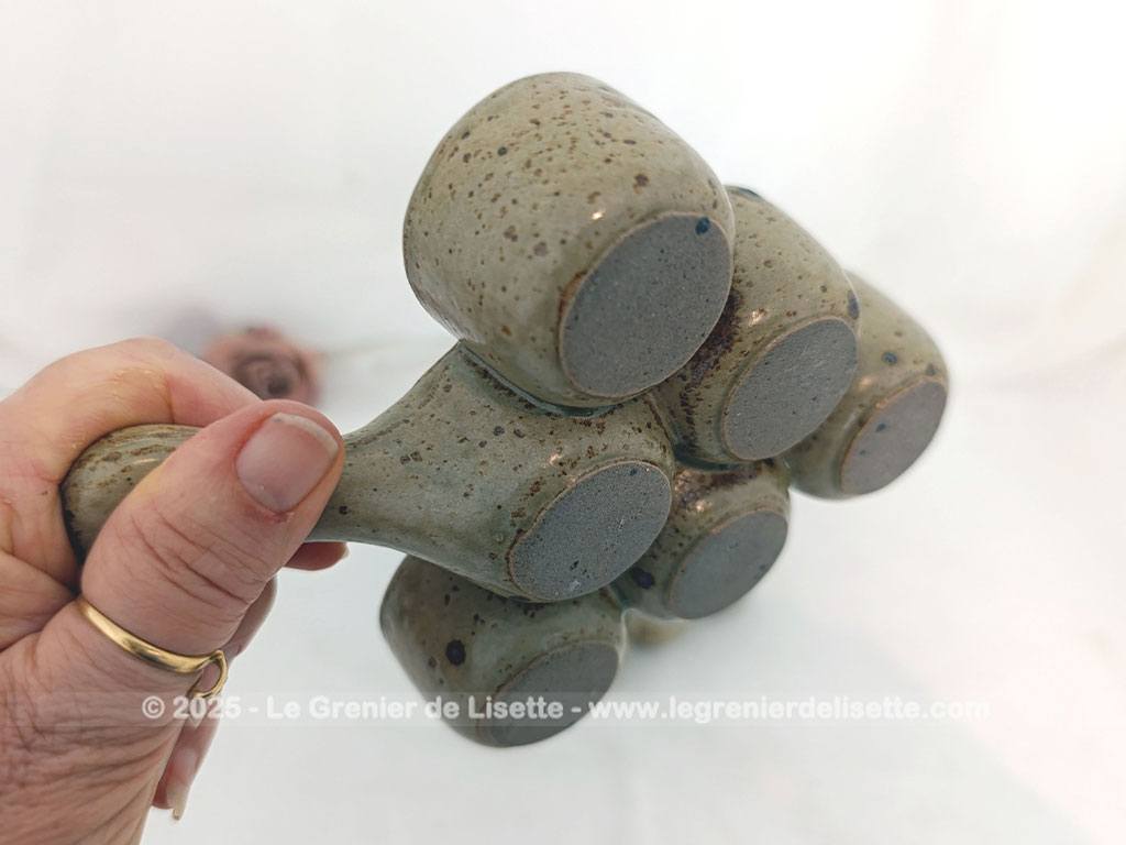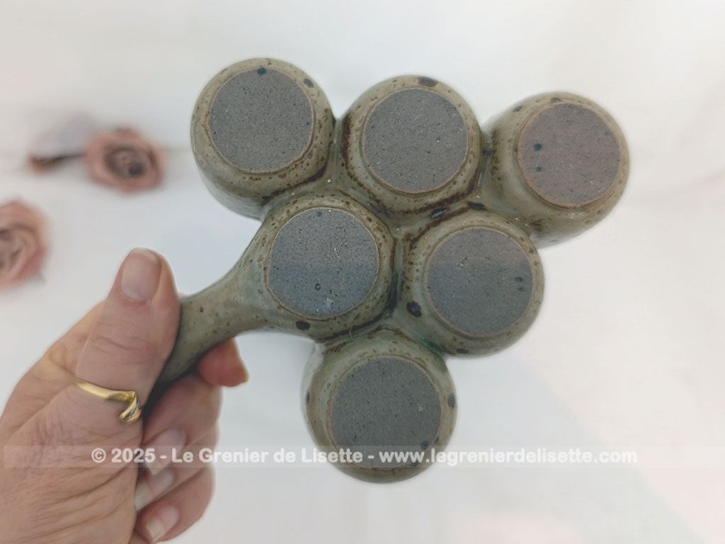 En grès émaillée, voici un lot de 2 plats vintages de présentation avec 6 emplacements. Prévue à l’origine pour des escargots, la taille des emplacements permet facilement de détourner ces plats ou assiettes de présentation. On peut y ranger aussi des oeufs de petites tailles ou autres idées culinaires de décoration. Ces plats vintages sont en grès beige moucheté couleur caramel. Ils ont une forme de triangle, comme un « sapin ». Ils mesurent 16.5 de long avec le manche. La partie présentoir est un triangle pratiquement isocèle de 12.5 cm de coté. La hauteur de l’ensemble est de 3.5 cm. Chaque compartiment mesure 4 cm de diamètre sur 3 cm de profondeur. On admire le coté artisanal de ces plats. Pas de signature, mais surement du pur Made in France !!! A vous de trouver les idées qui feront de nouveau vivre ces 2 plats pour de fins gourmets !