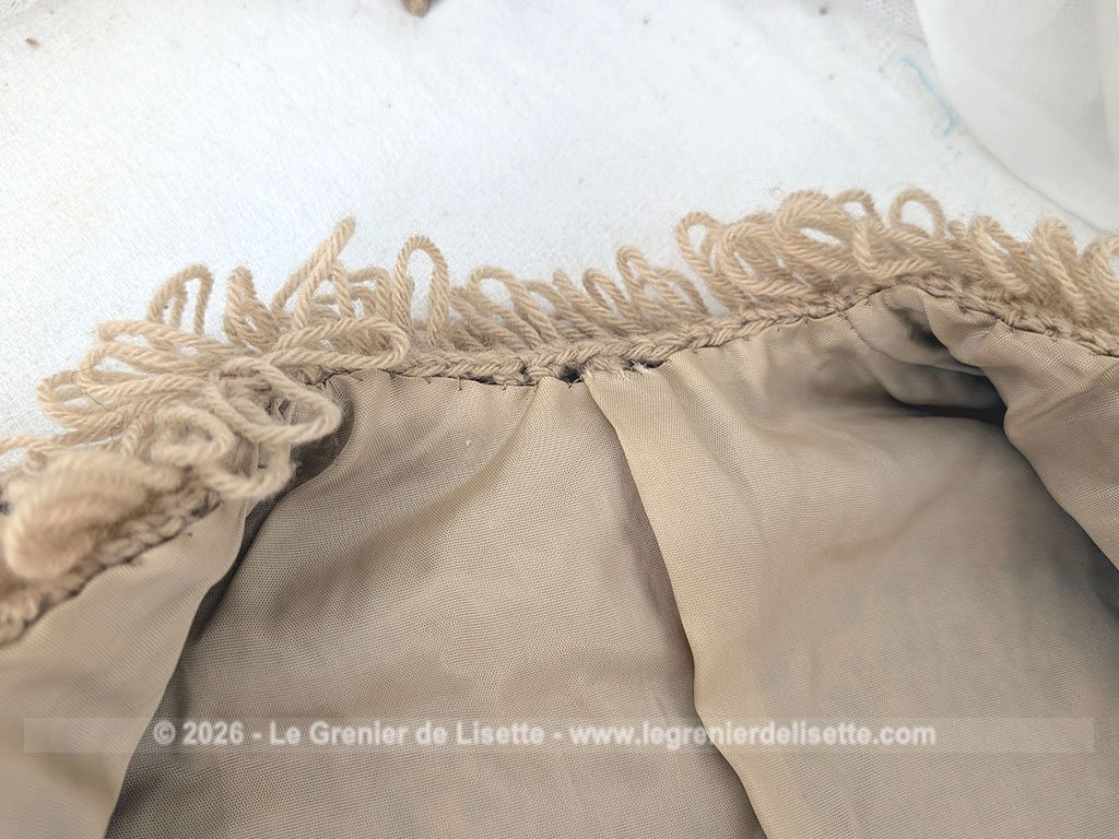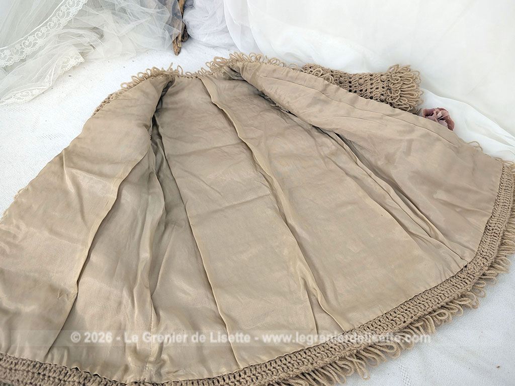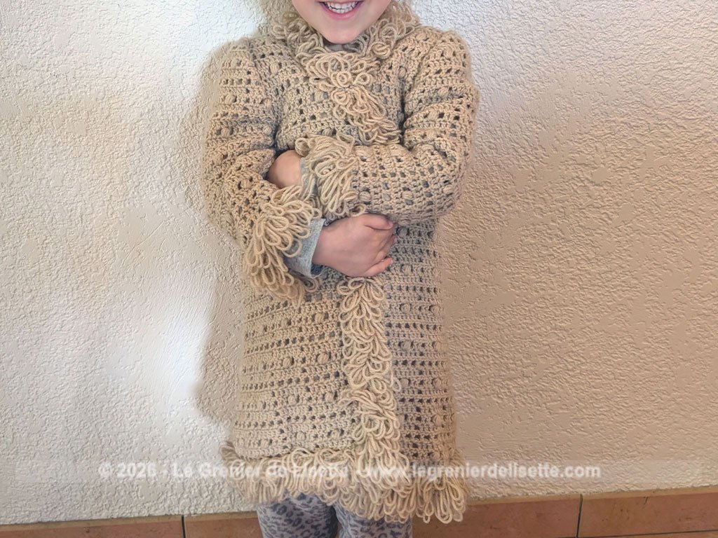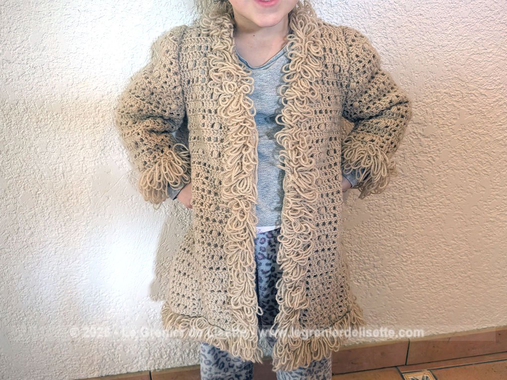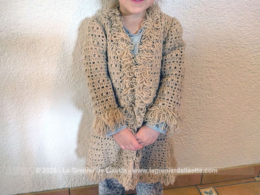 Voici une pièce artisanale soignée : un manteau pour enfant réalisé au crochet reprenant tous les codes de la mode des années 70. La laine beige est travaillée avec un point ajouré élégant. Toute l’originalité repose sur l’habillage en franges bouclées : celles-ci partent du col, bordent tout le devant et finissent sur le bas, créant un pourtour complet très généreux. On retrouve également ce travail de boucles au bas des manches pour une finition parfaite. L’intérieur est entièrement doublé d’un tissu satiné ton sur ton pour plus de confort. On aime son style rétro et sa coupe longue qui lui donnent une allure très authentique.