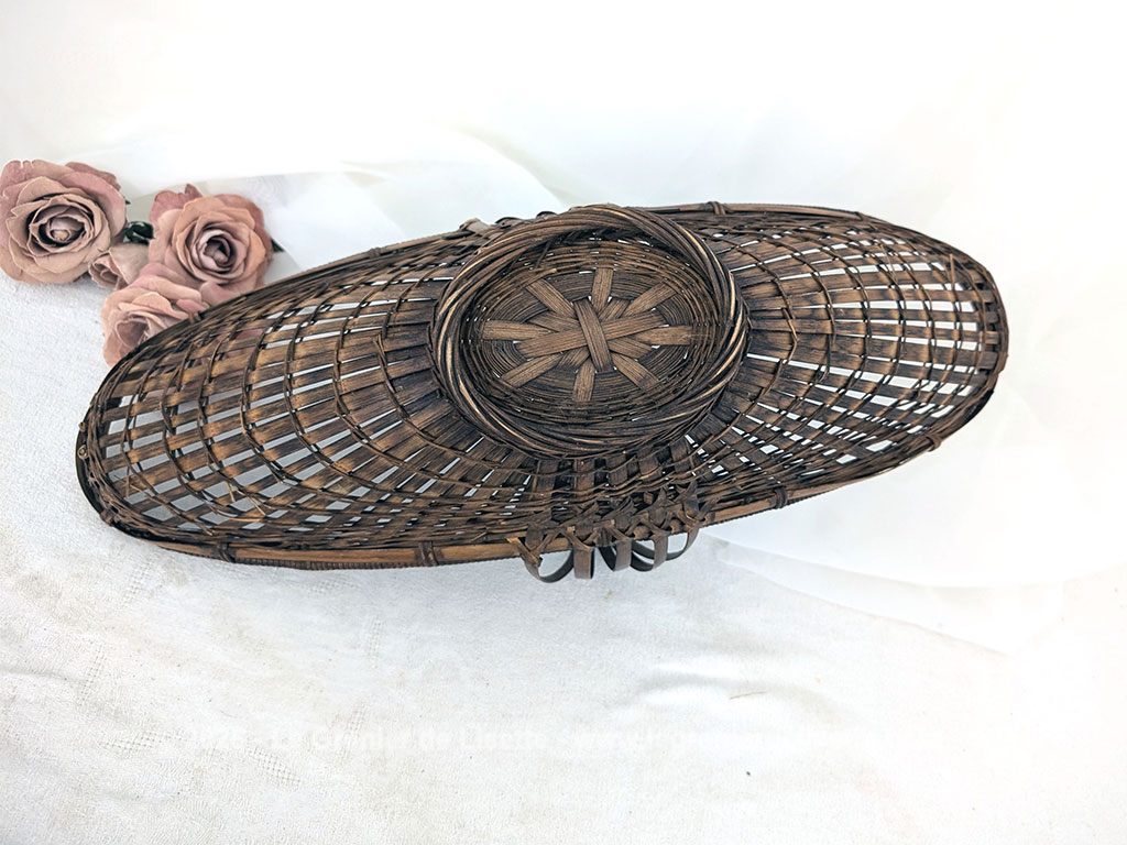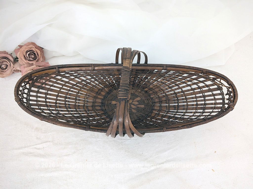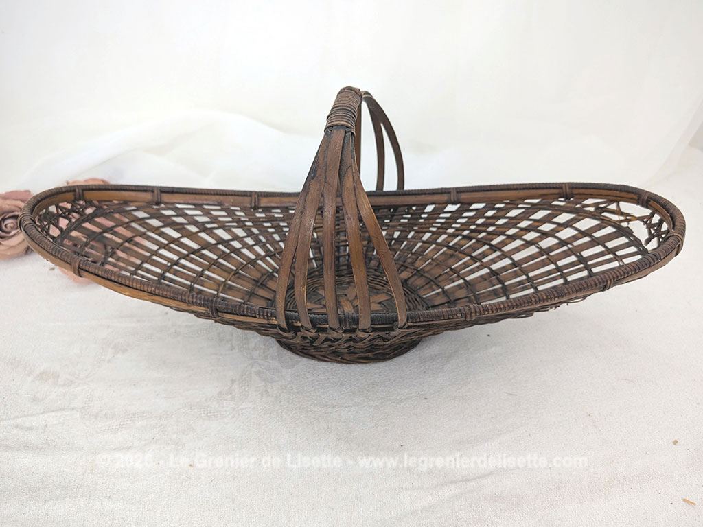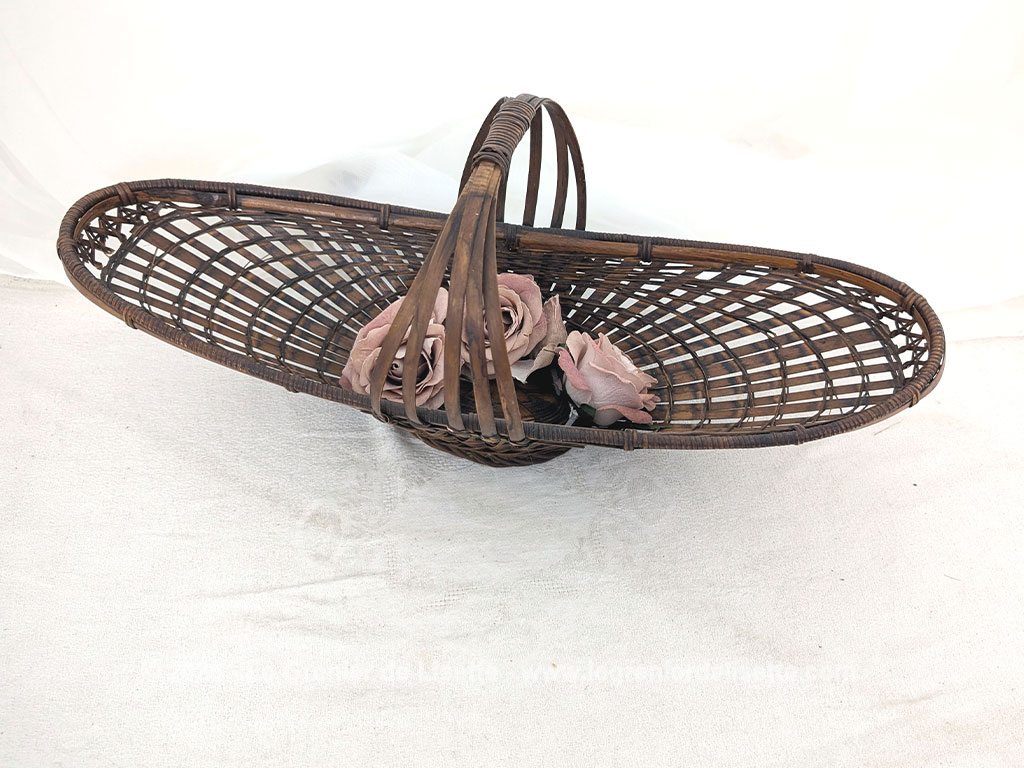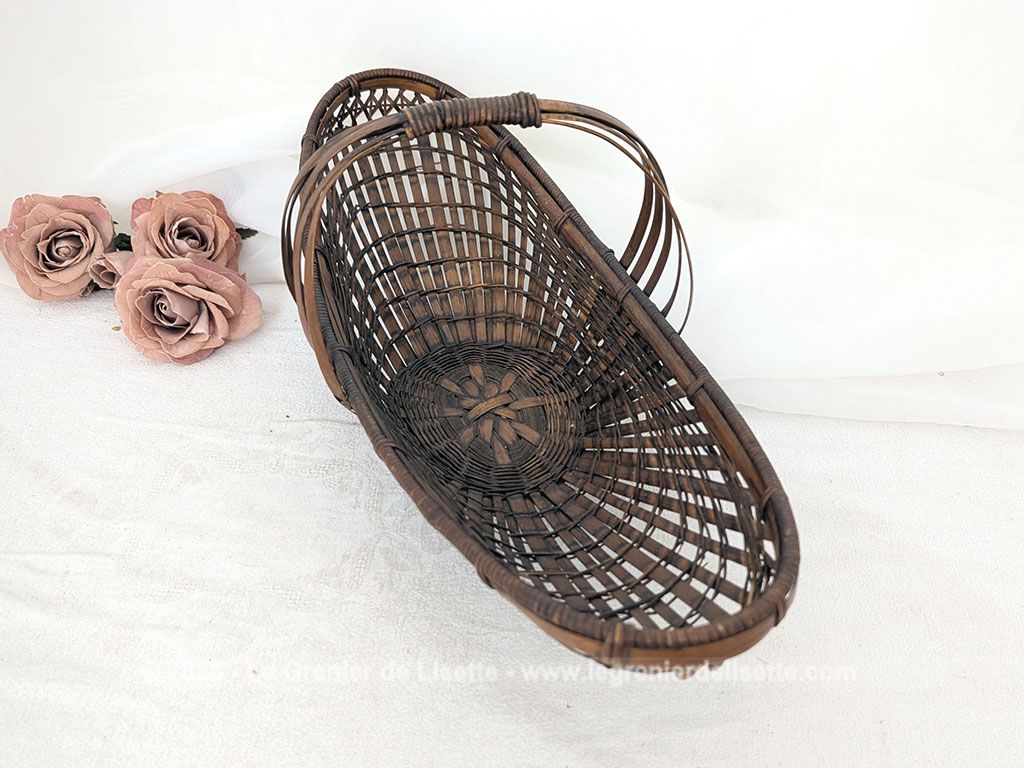 Voici un panier vintage en osier qui se distingue par sa forme allongée, par son tressage ajouré avec une anse haute composée de plusieurs brins. Idéal comme centre de table ou pour composer une décoration champêtre.
