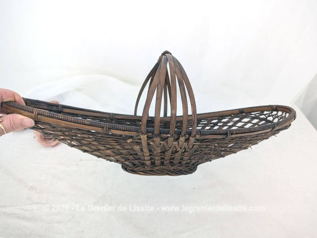 Fait main, voici un panier en osier, à la forme de navette ou barque très originale. Il mesure 47 cm par 16 cm sur 18 cm de haut. On découvre un travail de tressage ajouré remarquable et une belle patine boisée de l’osier. La anse est serrée par un lien d’osier qui ne va pas jusqu’au bout, il en manque un petit bout, et ce n’est presque pas visible. Sa grande anse stylisée est formée de cinq brins reliés au sommet, ce qui lui donne beaucoup d’élégance et de légèreté.Il est dans un bel état général, solide et prêt à servir.