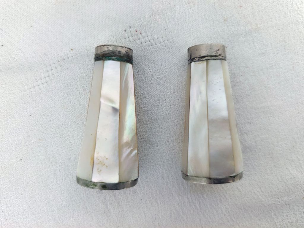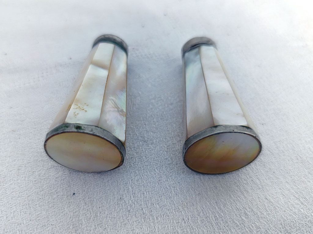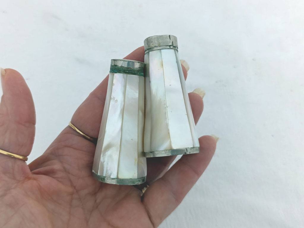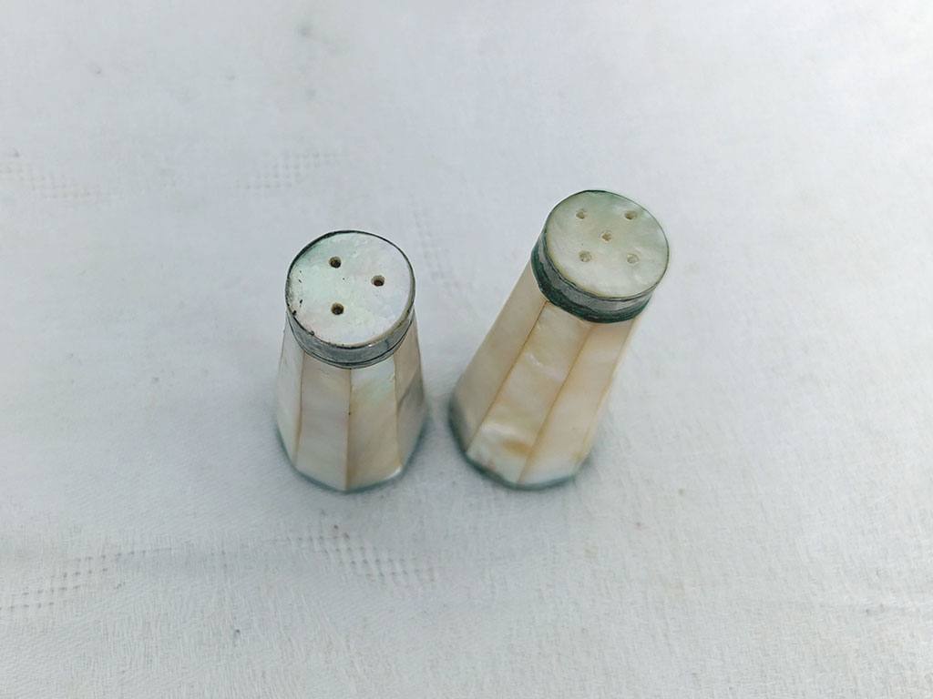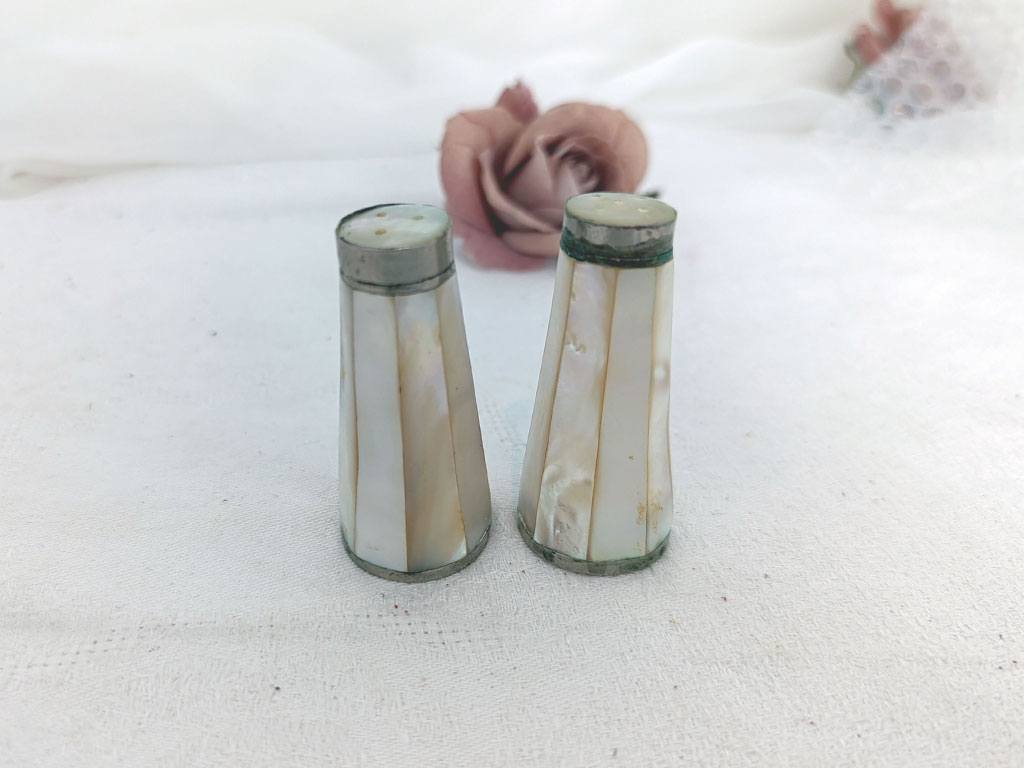 Charmant ancien duo salière et poivrière en nacre à facettes, aux reflets nacrés et au charme ancien, avec de très légères traces d’oxydation qui leur donnent tout leur caractère. Pour une table originale.