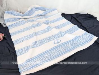 Voici une superbe et vintage serviette de toilette épaisse en éponge blanche aux motifs rayés bleus et décorée des broderies des lettres G et D brodées de fils bleus.