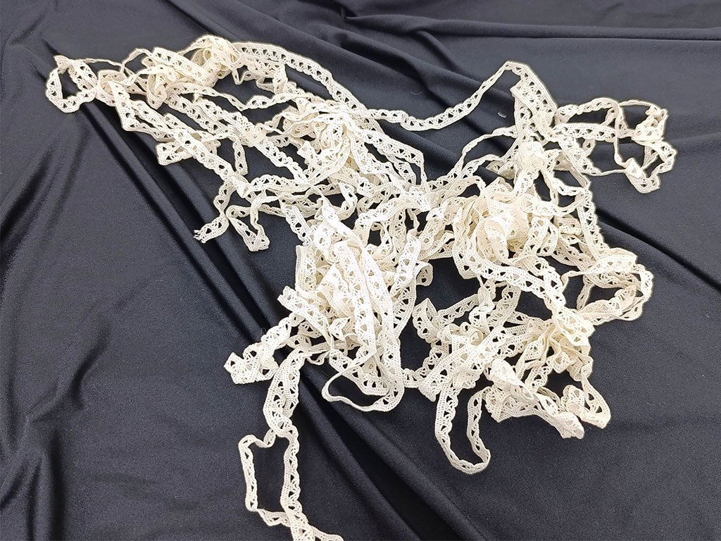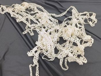 Voici un très long coupon de dentelle en un seul morceau avec plus de 15 mètres de long. On découvre une dentelle en fils, aux dessins ajourés et un dessin en vague sur une bordure. Pour des créations tout en délicatesse, alors à vos aiguilles Mesdames !