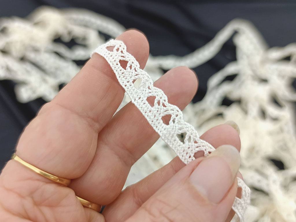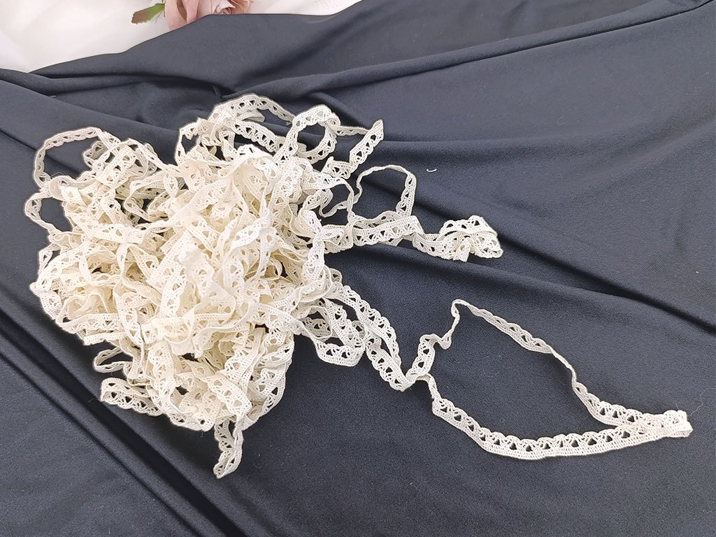 Plus de 15 mètres de long en un seul morceau d’une belle dentelle couleur ivoire de 1 cm de large avec une bordure en fines vagues. Pour de belles créations.